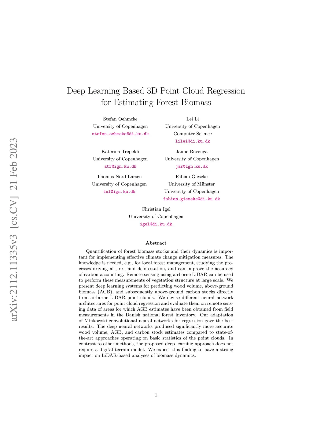 Quantification of forest biomass stocks and their dynamics is important for implementing effective climate change mitigation measures. The knowledge is needed, e.g., for local forest management, studying the processes driving af-, re-, and deforestation, and can improve the accuracy of carbon-accounting. Remote sensing using airborne LiDAR can be used to perform these measurements of vegetation structure at large scale. We present deep learning systems for predicting wood volume, above-ground biomass (AGB), and subsequently above-ground carbon stocks directly from airborne LiDAR point clouds. We devise different neural network architectures for point cloud regression and evaluate them on remote sensing data of areas for which AGB estimates have been obtained from field measurements in the Danish national forest inventory. Our adaptation of Minkowski convolutional neural networks for regression gave the best results. The deep neural networks produced significantly more accurate wood volume, AGB, and carbon stock estimates compared to state-of-the-art approaches operating on basic statistics of the point clouds. In contrast to other methods, the proposed deep learning approach does not require a digital terrain model. We expect this finding to have a strong impact on LiDAR-based analyses of biomass dynamics.