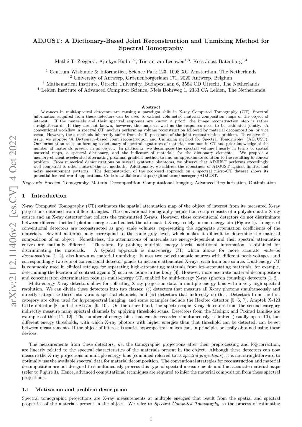 Advances in multi-spectral detectors are causing a paradigm shift in X-ray Computed Tomography (CT). Spectral information acquired from these detectors can be used to extract volumetric material composition maps of the object of interest. If the materials and their spectral responses are known a priori, the image reconstruction step is rather straightforward. If they are not known, however, the maps as well as the responses need to be estimated jointly. A conventional workflow in spectral CT involves performing volume reconstruction followed by material decomposition, or vice versa. However, these methods inherently suffer from the ill-posedness of the joint reconstruction problem. To resolve this issue, we propose Á Dictionary-based Joint reconstruction and Unmixing method for Spectral Tomography' (ADJUST). Our formulation relies on forming a dictionary of spectral signatures of materials common in CT and prior knowledge of the number of materials present in an object. In particular, we decompose the spectral volume linearly in terms of spatial material maps, a spectral dictionary, and the indicator of materials for the dictionary elements. We propose a memory-efficient accelerated alternating proximal gradient method to find an approximate solution to the resulting bi-convex problem. From numerical demonstrations on several synthetic phantoms, we observe that ADJUST performs exceedingly well compared to other state-of-the-art methods. Additionally, we address the robustness of ADJUST against limited and noisy measurement patterns. The demonstration of the proposed approach on a spectral micro-CT dataset shows its potential for real-world applications. Code is available at https://github.com/mzeegers/ADJUST.