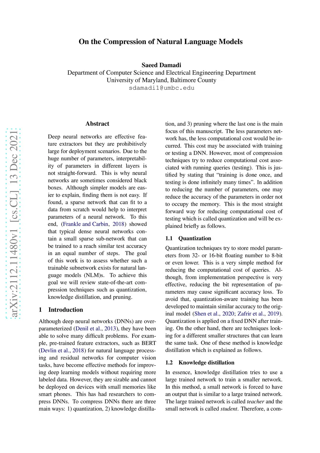 Deep neural networks are effective feature extractors but they are prohibitively large for deployment scenarios. Due to the huge number of parameters, interpretability of parameters in different layers is not straight-forward. This is why neural networks are sometimes considered black boxes. Although simpler models are easier to explain, finding them is not easy. If found, a sparse network that can fit to a data from scratch would help to interpret parameters of a neural network. To this end, lottery ticket hypothesis states that typical dense neural networks contain a small sparse sub-network that can be trained to a reach similar test accuracy in an equal number of steps. The goal of this work is to assess whether such a trainable subnetwork exists for natural language models (NLM)s. To achieve this goal we will review state-of-the-art compression techniques such as quantization, knowledge distillation, and pruning.