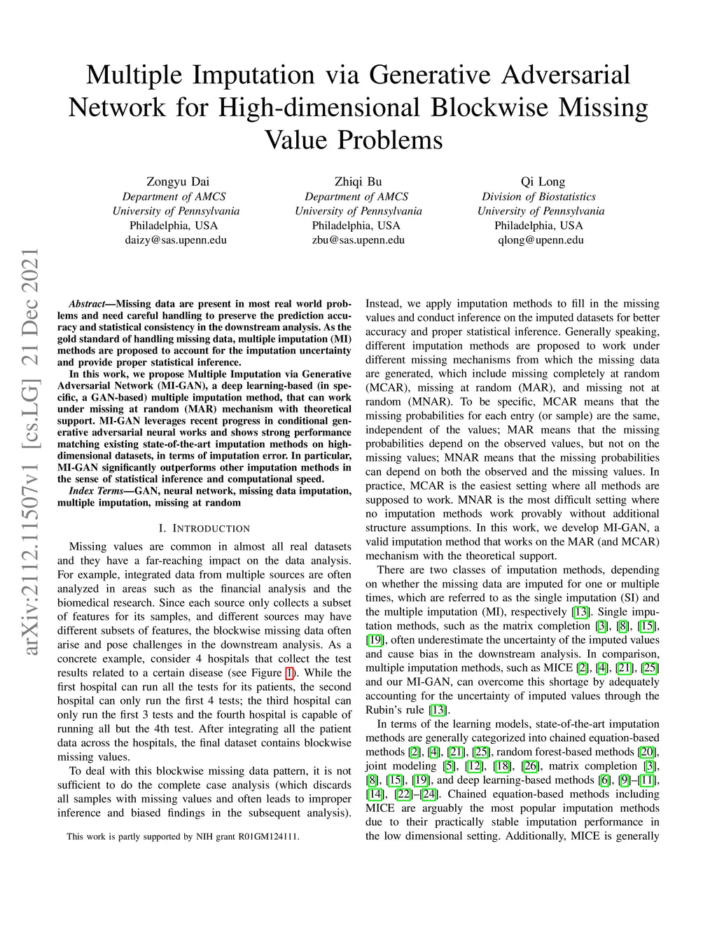 Missing data are present in most real world problems and need careful handling to preserve the prediction accuracy and statistical consistency in the downstream analysis. As the gold standard of handling missing data, multiple imputation (MI) methods are proposed to account for the imputation uncertainty and provide proper statistical inference. In this work, we propose Multiple Imputation via Generative Adversarial Network (MI-GAN), a deep learning-based (in specific, a GAN-based) multiple imputation method, that can work under missing at random (MAR) mechanism with theoretical support. MI-GAN leverages recent progress in conditional generative adversarial neural works and shows strong performance matching existing state-of-the-art imputation methods on high-dimensional datasets, in terms of imputation error. In particular, MI-GAN significantly outperforms other imputation methods in the sense of statistical inference and computational speed.