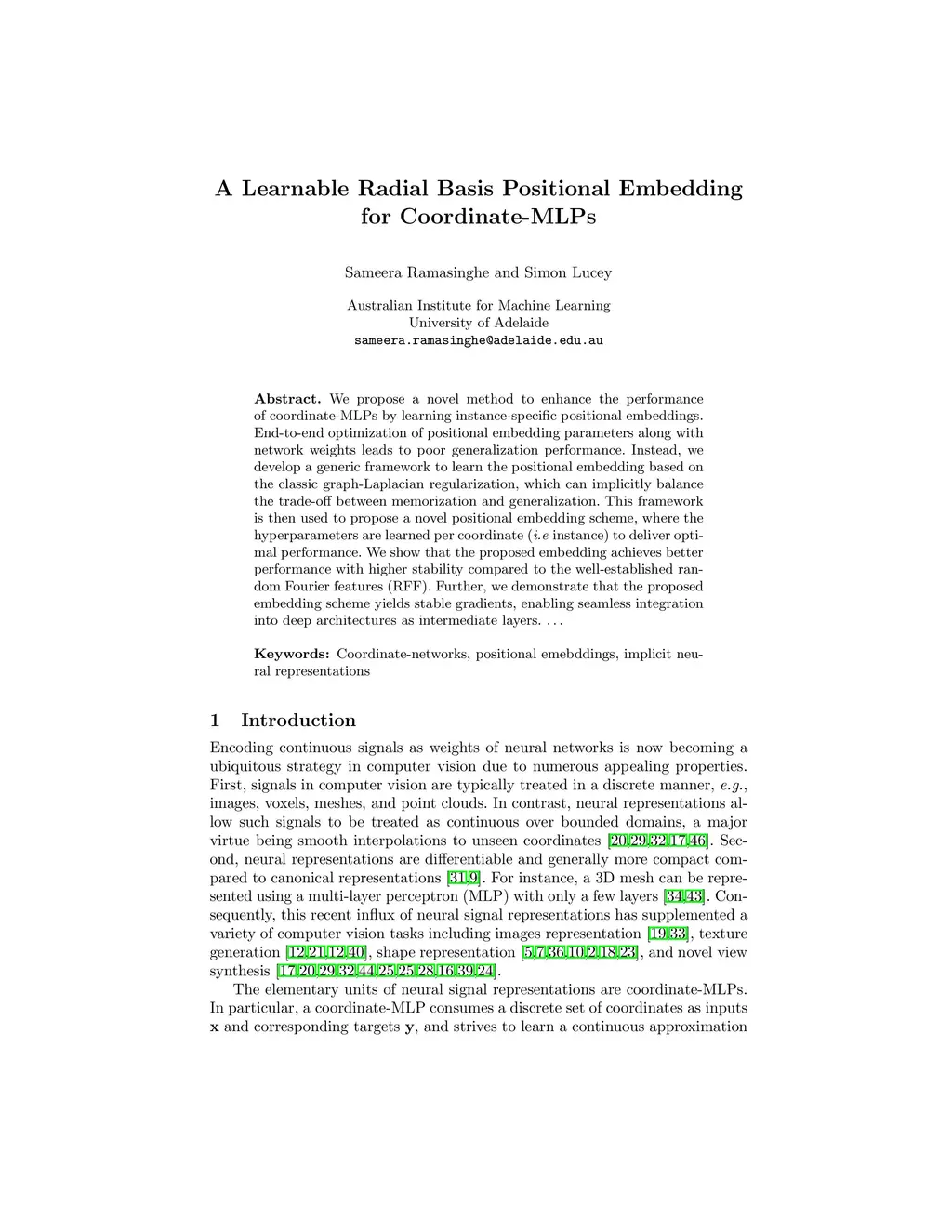 We propose a novel method to enhance the performance of coordinate-MLPs by learning instance-specific positional embeddings. End-to-end optimization of positional embedding parameters along with network weights leads to poor generalization performance. Instead, we develop a generic framework to learn the positional embedding based on the classic graph-Laplacian regularization, which can implicitly balance the trade-off between memorization and generalization. This framework is then used to propose a novel positional embedding scheme, where the hyperparameters are learned per coordinate (i.e, instance) to deliver optimal performance. We show that the proposed embedding achieves better performance with higher stability compared to the well-established random Fourier features (RFF). Further, we demonstrate that the proposed embedding scheme yields stable gradients, enabling seamless integration into deep architectures as intermediate layers.