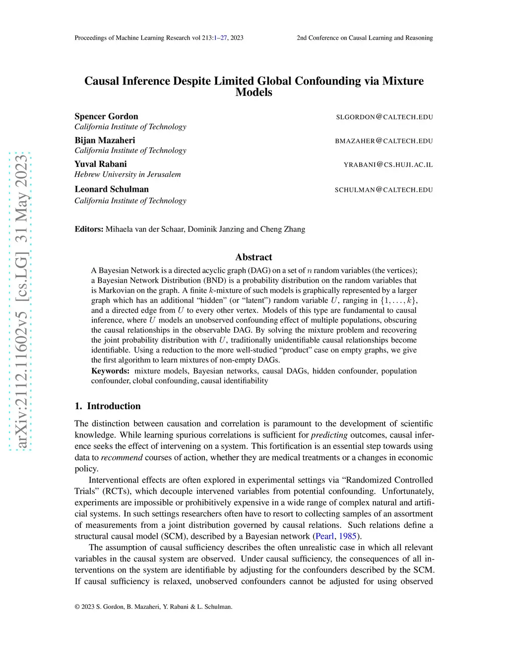 A Bayesian Network is a directed acyclic graph (DAG) on a set of random variables (the vertices); a Bayesian Network Distribution (BND) is a probability distribution on the random variables that is Markovian on the graph. A finite -mixture of such models is graphically represented by a larger graph which has an additional ``hidden'' (or ``latent'') random variable , ranging in , and a directed edge from to every other vertex. Models of this type are fundamental to causal inference, where models an unobserved confounding effect of multiple populations, obscuring the causal relationships in the observable DAG. By solving the mixture problem and recovering the joint probability distribution with , traditionally unidentifiable causal relationships become identifiable. Using a reduction to the more well-studied ``product'' case on empty graphs, we give the first algorithm to learn mixtures of non-empty DAGs.
