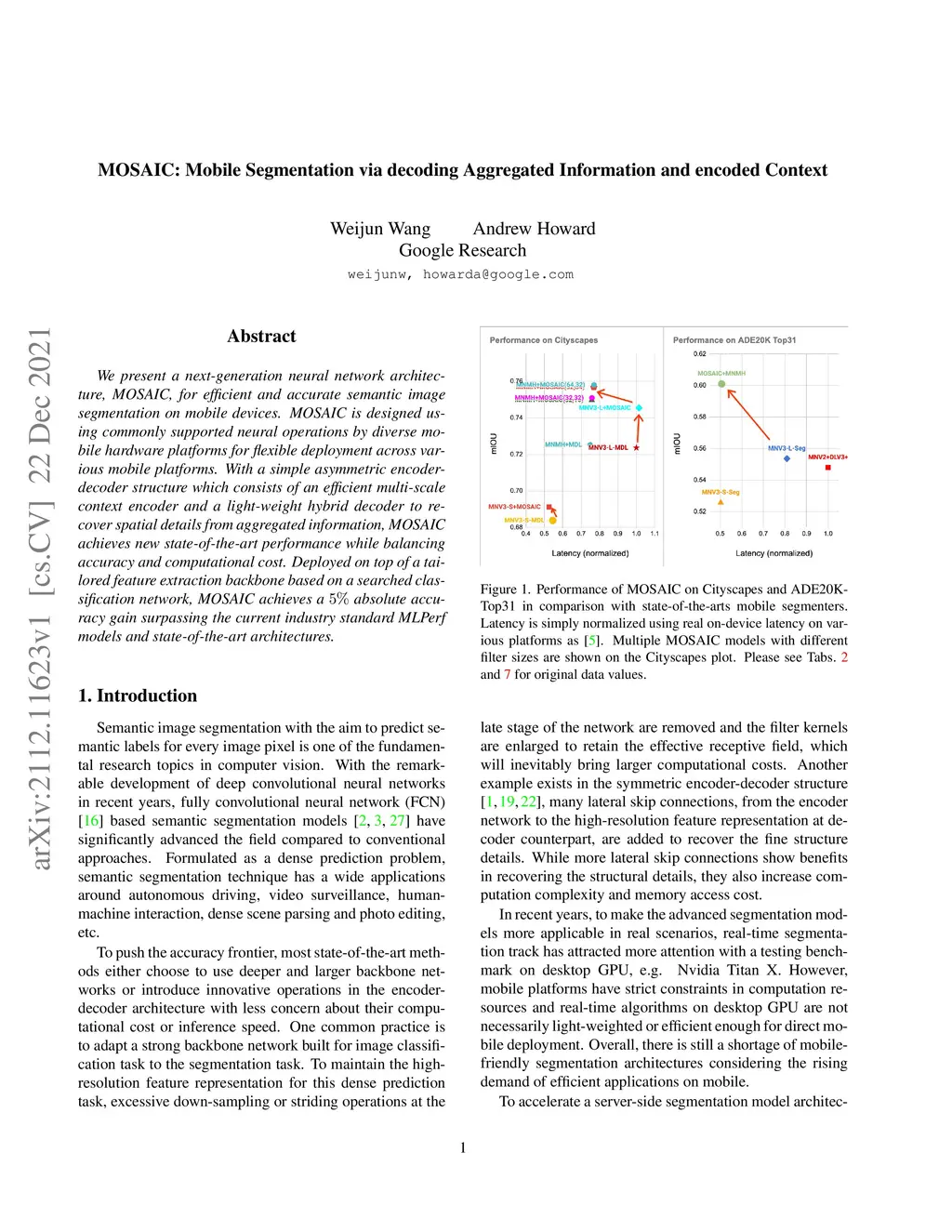 We present a next-generation neural network architecture, MOSAIC, for efficient and accurate semantic image segmentation on mobile devices. MOSAIC is designed using commonly supported neural operations by diverse mobile hardware platforms for flexible deployment across various mobile platforms. With a simple asymmetric encoder-decoder structure which consists of an efficient multi-scale context encoder and a light-weight hybrid decoder to recover spatial details from aggregated information, MOSAIC achieves new state-of-the-art performance while balancing accuracy and computational cost. Deployed on top of a tailored feature extraction backbone based on a searched classification network, MOSAIC achieves a 5% absolute accuracy gain surpassing the current industry standard MLPerf models and state-of-the-art architectures.