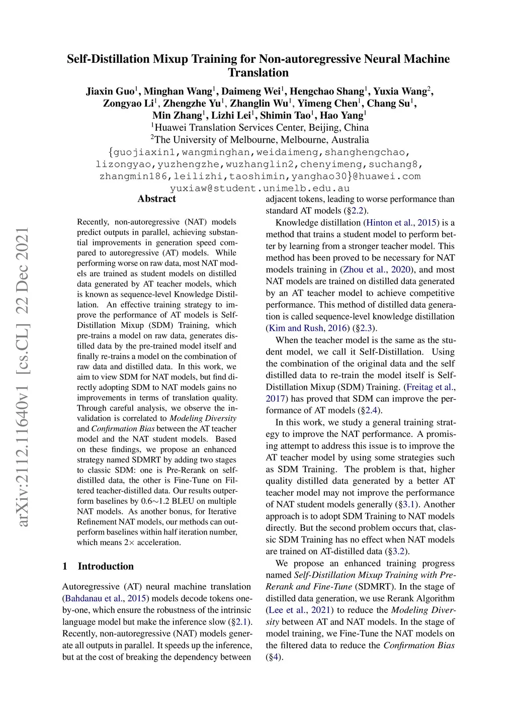 Recently, non-autoregressive (NAT) models predict outputs in parallel, achieving substantial improvements in generation speed compared to autoregressive (AT) models. While performing worse on raw data, most NAT models are trained as student models on distilled data generated by AT teacher models, which is known as sequence-level Knowledge Distillation. An effective training strategy to improve the performance of AT models is Self-Distillation Mixup (SDM) Training, which pre-trains a model on raw data, generates distilled data by the pre-trained model itself and finally re-trains a model on the combination of raw data and distilled data. In this work, we aim to view SDM for NAT models, but find directly adopting SDM to NAT models gains no improvements in terms of translation quality. Through careful analysis, we observe the invalidation is correlated to Modeling Diversity and Confirmation Bias between the AT teacher model and the NAT student models. Based on these findings, we propose an enhanced strategy named SDMRT by adding two stages to classic SDM: one is Pre-Rerank on self-distilled data, the other is Fine-Tune on Filtered teacher-distilled data. Our results outperform baselines by 0.6 to 1.2 BLEU on multiple NAT models. As another bonus, for Iterative Refinement NAT models, our methods can outperform baselines within half iteration number, which means 2X acceleration.
