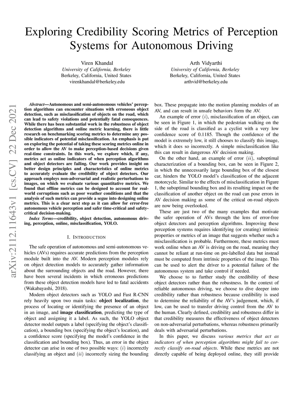 Autonomous and semi-autonomous vehicles' perception algorithms can encounter situations with erroneous object detection, such as misclassification of objects on the road, which can lead to safety violations and potentially fatal consequences. While there has been substantial work in the robustness of object detection algorithms and online metric learning, there is little research on benchmarking scoring metrics to determine any possible indicators of potential misclassification. An emphasis is put on exploring the potential of taking these scoring metrics online in order to allow the AV to make perception-based decisions given real-time constraints. In this work, we explore which, if any, metrics act as online indicators of when perception algorithms and object detectors are failing. Our work provides insight on better design principles and characteristics of online metrics to accurately evaluate the credibility of object detectors. Our approach employs non-adversarial and realistic perturbations to images, on which we evaluate various quantitative metrics. We found that offline metrics can be designed to account for real-world corruptions such as poor weather conditions and that the analysis of such metrics can provide a segue into designing online metrics. This is a clear next step as it can allow for error-free autonomous vehicle perception and safer time-critical and safety-critical decision-making.