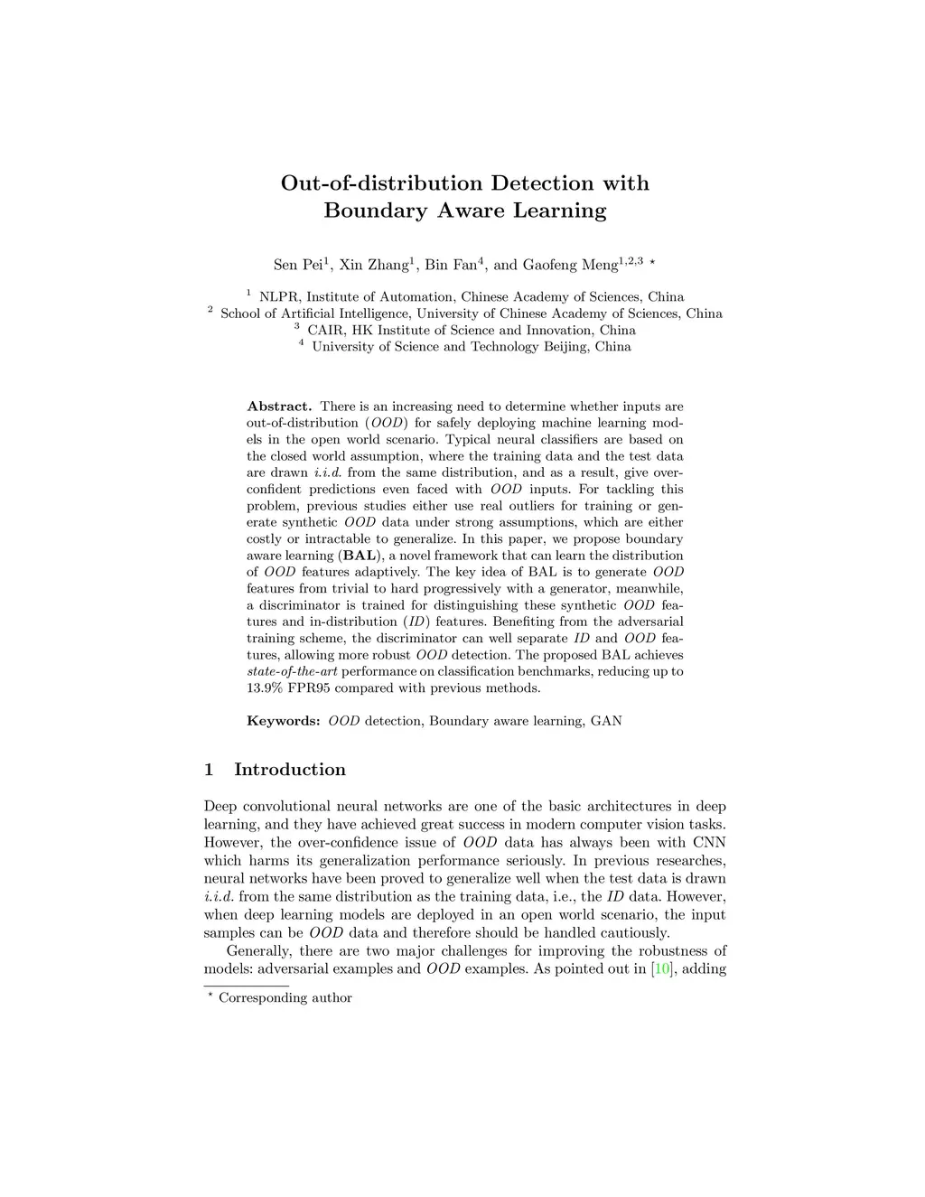 There is an increasing need to determine whether inputs are out-of-distribution (\emph{OOD}) for safely deploying machine learning models in the open world scenario. Typical neural classifiers are based on the closed world assumption, where the training data and the test data are drawn \emph{i.i.d.} from the same distribution, and as a result, give over-confident predictions even faced with \emph{OOD} inputs. For tackling this problem, previous studies either use real outliers for training or generate synthetic \emph{OOD} data under strong assumptions, which are either costly or intractable to generalize. In this paper, we propose boundary aware learning (\textbf{BAL}), a novel framework that can learn the distribution of \emph{OOD} features adaptively. The key idea of BAL is to generate \emph{OOD} features from trivial to hard progressively with a generator, meanwhile, a discriminator is trained for distinguishing these synthetic \emph{OOD} features and in-distribution (\emph{ID}) features. Benefiting from the adversarial training scheme, the discriminator can well separate \emph{ID} and \emph{OOD} features, allowing more robust \emph{OOD} detection. The proposed BAL achieves \emph{state-of-the-art} performance on classification benchmarks, reducing up to 13.9\% FPR95 compared with previous methods.
