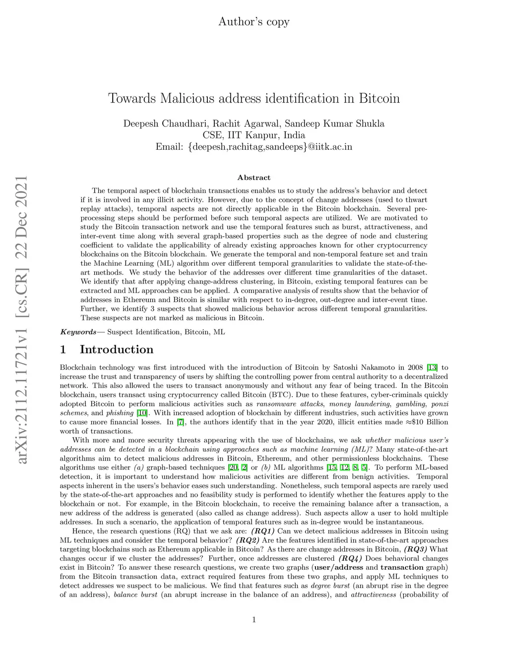 Towards Malicious address identification in Bitcoin