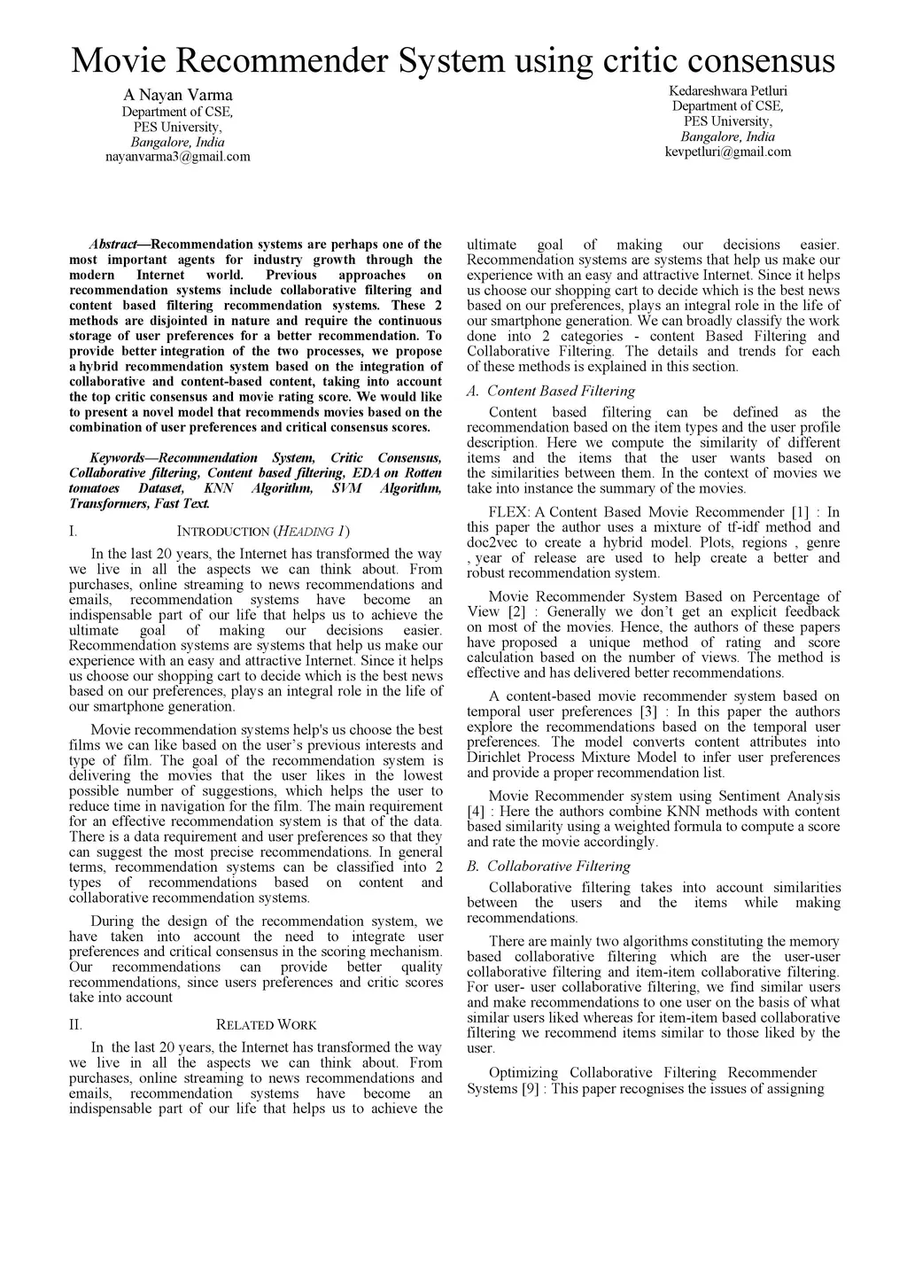 Recommendation systems are perhaps one of the most important agents for industry growth through the modern Internet world. Previous approaches on recommendation systems include collaborative filtering and content based filtering recommendation systems. These 2 methods are disjointed in nature and require the continuous storage of user preferences for a better recommendation. To provide better integration of the two processes, we propose a hybrid recommendation system based on the integration of collaborative and content-based content, taking into account the top critic consensus and movie rating score. We would like to present a novel model that recommends movies based on the combination of user preferences and critical consensus scores.