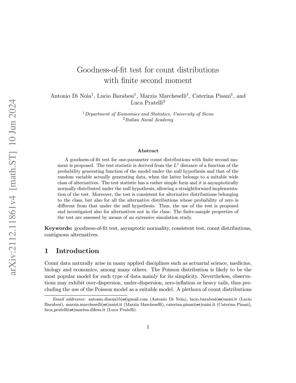 A goodness-of-fit test for one-parameter count distributions with finite second moment is proposed. The test statistic is derived from the distance of a function of the probability generating function of the model under the null hypothesis and that of the random variable actually generating data, when the latter belongs to a suitable wide class of alternatives. The test statistic has a rather simple form and it is asymptotically normally distributed under the null hypothesis, allowing a straightforward implementation of the test. Moreover, the test is consistent for alternative distributions belonging to the class, but also for all the alternative distributions whose probability of zero is different from that under the null hypothesis. Thus, the use of the test is proposed and investigated also for alternatives not in the class. The finite-sample properties of the test are assessed by means of an extensive simulation study.