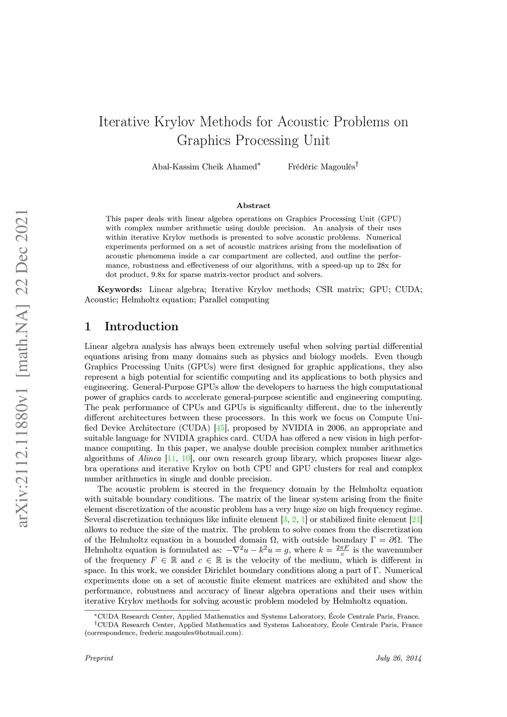 This paper deals with linear algebra operations on Graphics Processing Unit (GPU) with complex number arithmetic using double precision. An analysis of their uses within iterative Krylov methods is presented to solve acoustic problems. Numerical experiments performed on a set of acoustic matrices arising from the modelisation of acoustic phenomena inside a car compartment are collected, and outline the performance, robustness and effectiveness of our algorithms, with a speed-up up to 28x for dot product, 9.8x for sparse matrix-vector product and solvers.