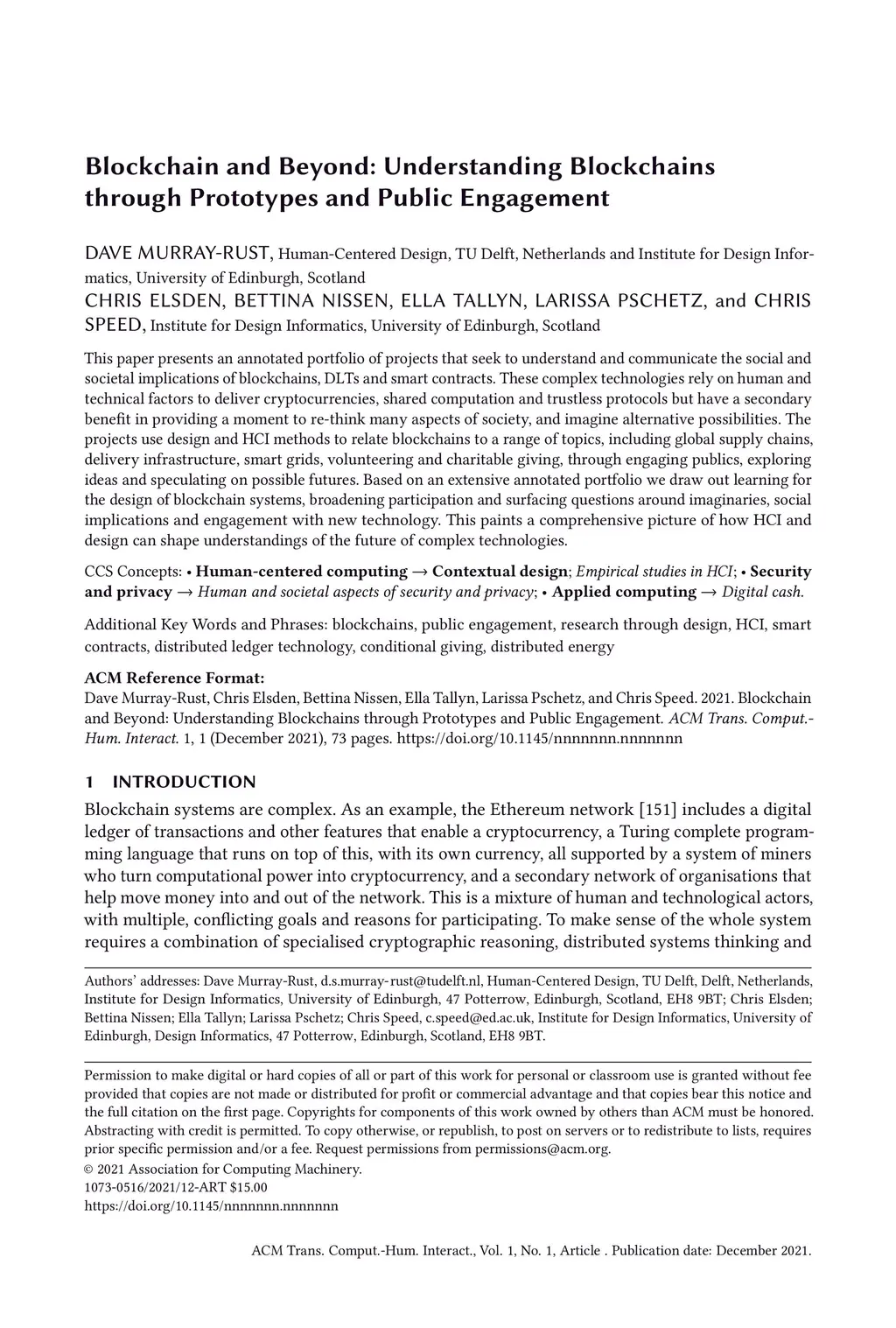 This paper presents an annotated portfolio of projects that seek to understand and communicate the social and societal implications of blockchains, distributed ledgers and smart contracts. These complex technologies rely on human and technical factors to deliver cryptocurrencies, shared computation and trustless protocols but have a secondary benefit in providing a moment to re-think many aspects of society, and imagine alternative possibilities. The projects use design and HCI methods to relate blockchains to a range of topics, including global supply chains, delivery infrastructure, smart grids, volunteering and charitable giving, through engaging publics, exploring ideas and speculating on possible futures. Based on an extensive annotated portfolio we draw out learning for the design of blockchain systems, broadening participation and surfacing questions around imaginaries, social implications and engagement with new technology. This paints a comprehensive picture of how HCI and design can shape understandings of the future of complex technologies.