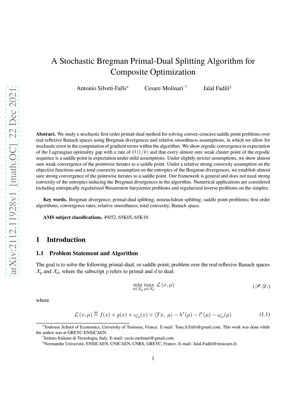 We study a stochastic first order primal-dual method for solving convex-concave saddle point problems over real reflexive Banach spaces using Bregman divergences and relative smoothness assumptions, in which we allow for stochastic error in the computation of gradient terms within the algorithm. We show ergodic convergence in expectation of the Lagrangian optimality gap with a rate of O(1/k) and that every almost sure weak cluster point of the ergodic sequence is a saddle point in expectation under mild assumptions. Under slightly stricter assumptions, we show almost sure weak convergence of the pointwise iterates to a saddle point. Under a relative strong convexity assumption on the objective functions and a total convexity assumption on the entropies of the Bregman divergences, we establish almost sure strong convergence of the pointwise iterates to a saddle point. Our framework is general and does not need strong convexity of the entropies inducing the Bregman divergences in the algorithm. Numerical applications are considered including entropically regularized Wasserstein barycenter problems and regularized inverse problems on the simplex.