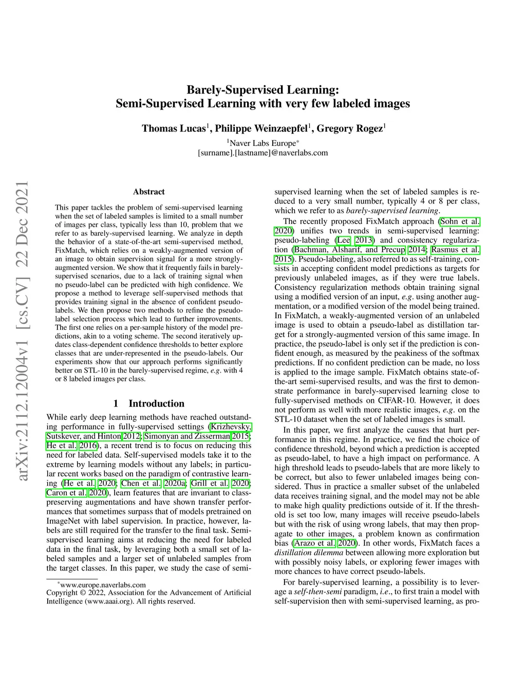 This paper tackles the problem of semi-supervised learning when the set of labeled samples is limited to a small number of images per class, typically less than 10, problem that we refer to as barely-supervised learning. We analyze in depth the behavior of a state-of-the-art semi-supervised method, FixMatch, which relies on a weakly-augmented version of an image to obtain supervision signal for a more strongly-augmented version. We show that it frequently fails in barely-supervised scenarios, due to a lack of training signal when no pseudo-label can be predicted with high confidence. We propose a method to leverage self-supervised methods that provides training signal in the absence of confident pseudo-labels. We then propose two methods to refine the pseudo-label selection process which lead to further improvements. The first one relies on a per-sample history of the model predictions, akin to a voting scheme. The second iteratively updates class-dependent confidence thresholds to better explore classes that are under-represented in the pseudo-labels. Our experiments show that our approach performs significantly better on STL-10 in the barely-supervised regime, e.g. with 4 or 8 labeled images per class.