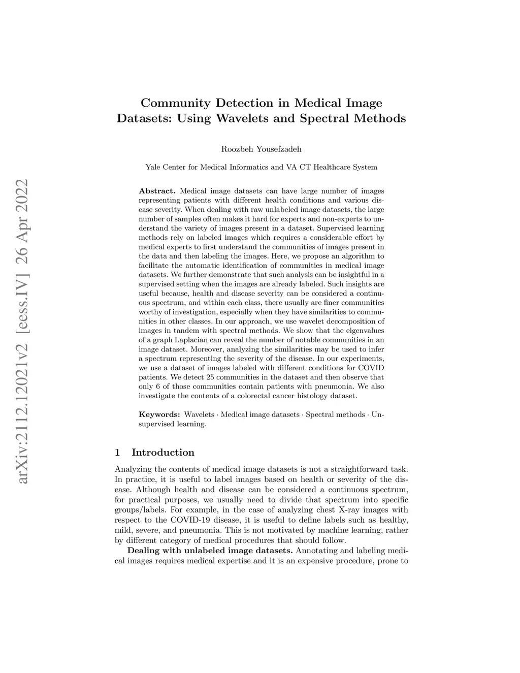 Medical image datasets can have large number of images representing patients with different health conditions and various disease severity. When dealing with raw unlabeled image datasets, the large number of samples often makes it hard for experts and non-experts to understand the variety of images present in a dataset. Supervised learning methods rely on labeled images which requires a considerable effort by medical experts to first understand the communities of images present in the data and then labeling the images. Here, we propose an algorithm to facilitate the automatic identification of communities in medical image datasets. We further demonstrate that such analysis can be insightful in a supervised setting when the images are already labeled. Such insights are useful because, health and disease severity can be considered a continuous spectrum, and within each class, there usually are finer communities worthy of investigation, especially when they have similarities to communities in other classes. In our approach, we use wavelet decomposition of images in tandem with spectral methods. We show that the eigenvalues of a graph Laplacian can reveal the number of notable communities in an image dataset. Moreover, analyzing the similarities may be used to infer a spectrum representing the severity of the disease. In our experiments, we use a dataset of images labeled with different conditions for COVID patients. We detect 25 communities in the dataset and then observe that only 6 of those communities contain patients with pneumonia. We also investigate the contents of a colorectal cancer histology dataset.