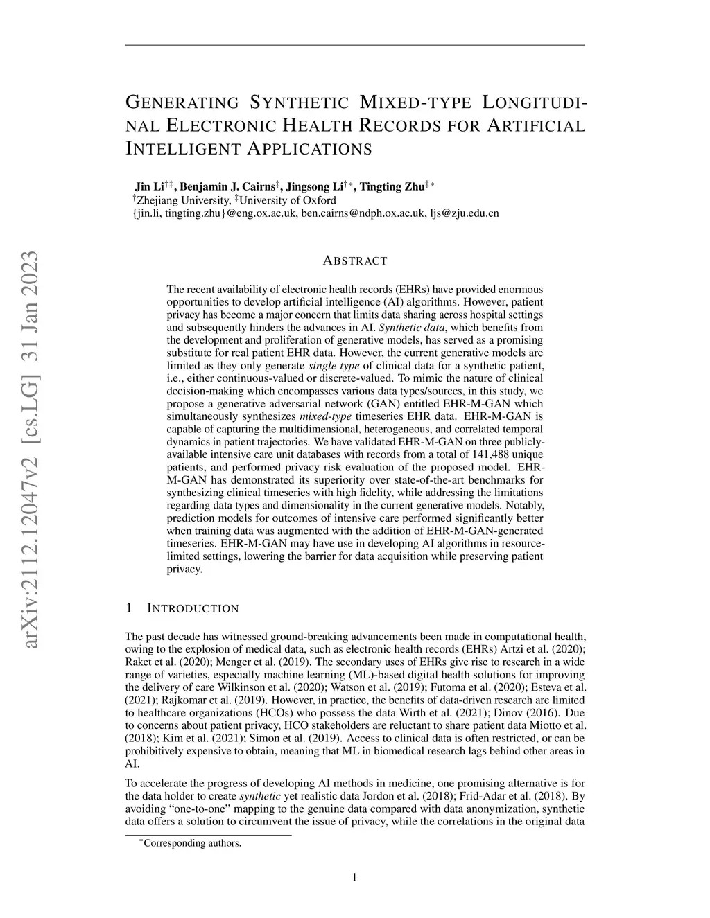 The recent availability of electronic health records (EHRs) have provided enormous opportunities to develop artificial intelligence (AI) algorithms. However, patient privacy has become a major concern that limits data sharing across hospital settings and subsequently hinders the advances in AI. Synthetic data, which benefits from the development and proliferation of generative models, has served as a promising substitute for real patient EHR data. However, the current generative models are limited as they only generate single type of clinical data for a synthetic patient, i.e., either continuous-valued or discrete-valued. To mimic the nature of clinical decision-making which encompasses various data types/sources, in this study, we propose a generative adversarial network (GAN) entitled EHR-M-GAN which simultaneously synthesizes mixed-type timeseries EHR data. EHR-M-GAN is capable of capturing the multidimensional, heterogeneous, and correlated temporal dynamics in patient trajectories. We have validated EHR-M-GAN on three publicly-available intensive care unit databases with records from a total of 141,488 unique patients, and performed privacy risk evaluation of the proposed model. EHR-M-GAN has demonstrated its superiority over state-of-the-art benchmarks for synthesizing clinical timeseries with high fidelity, while addressing the limitations regarding data types and dimensionality in the current generative models. Notably, prediction models for outcomes of intensive care performed significantly better when training data was augmented with the addition of EHR-M-GAN-generated timeseries. EHR-M-GAN may have use in developing AI algorithms in resource-limited settings, lowering the barrier for data acquisition while preserving patient privacy.