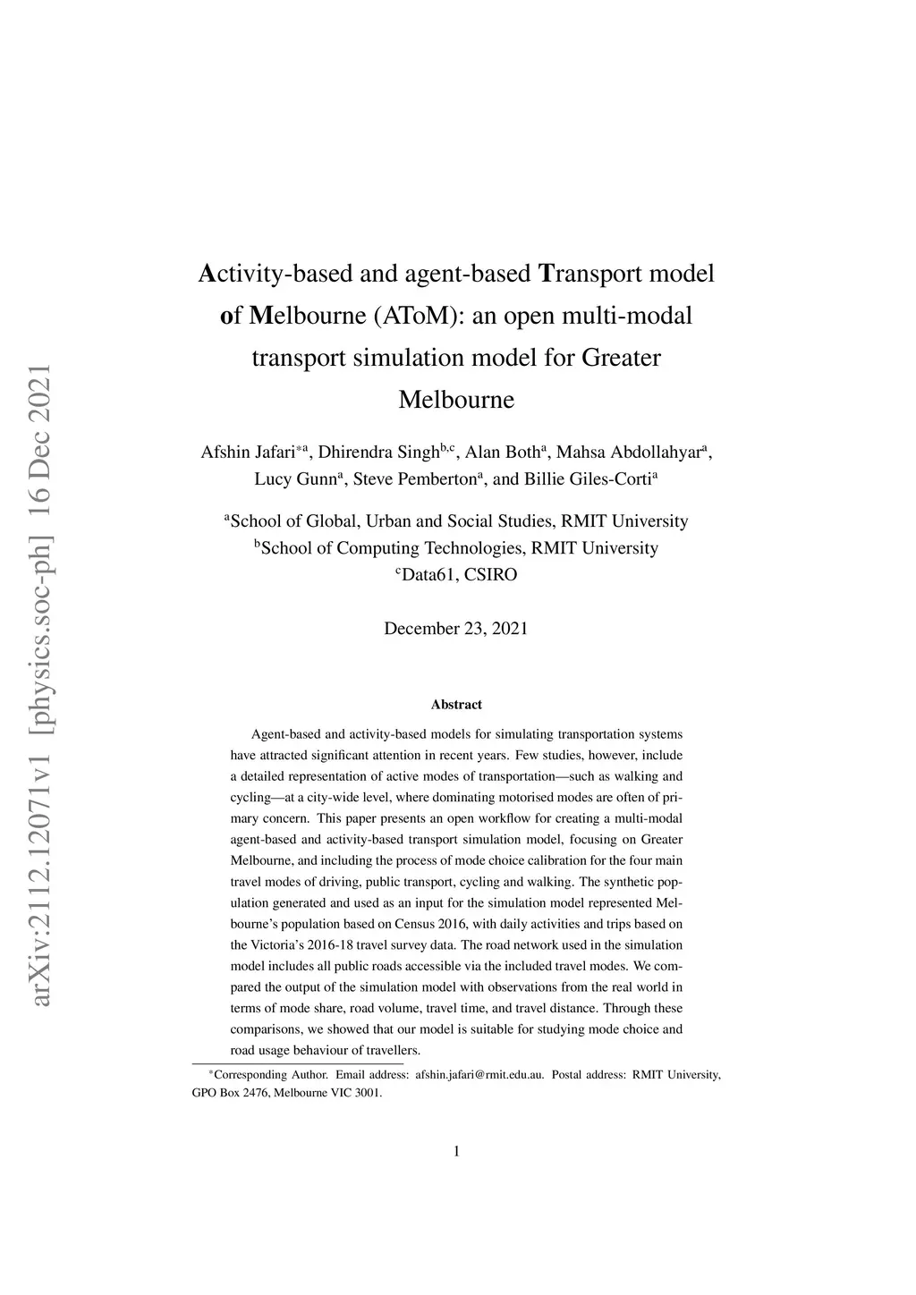 Activity-based and agent-based Transport model of Melbourne (AToM): an
