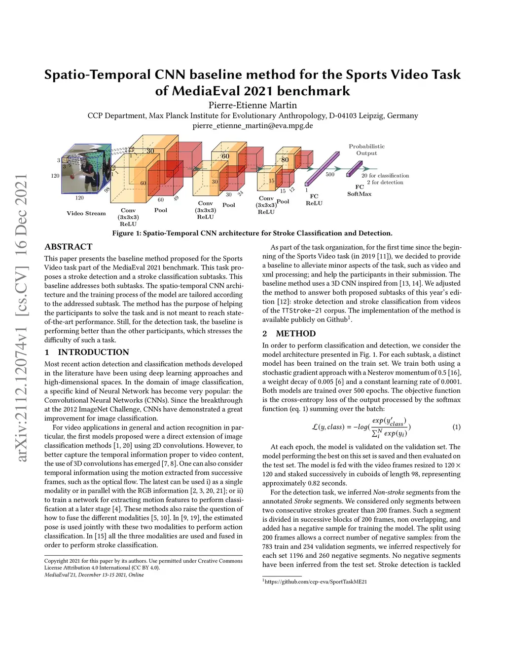 This paper presents the baseline method proposed for the Sports Video task part of the MediaEval 2021 benchmark. This task proposes a stroke detection and a stroke classification subtasks. This baseline addresses both subtasks. The spatio-temporal CNN architecture and the training process of the model are tailored according to the addressed subtask. The method has the purpose of helping the participants to solve the task and is not meant to reach stateof-the-art performance. Still, for the detection task, the baseline is performing better than the other participants, which stresses the difficulty of such a task.