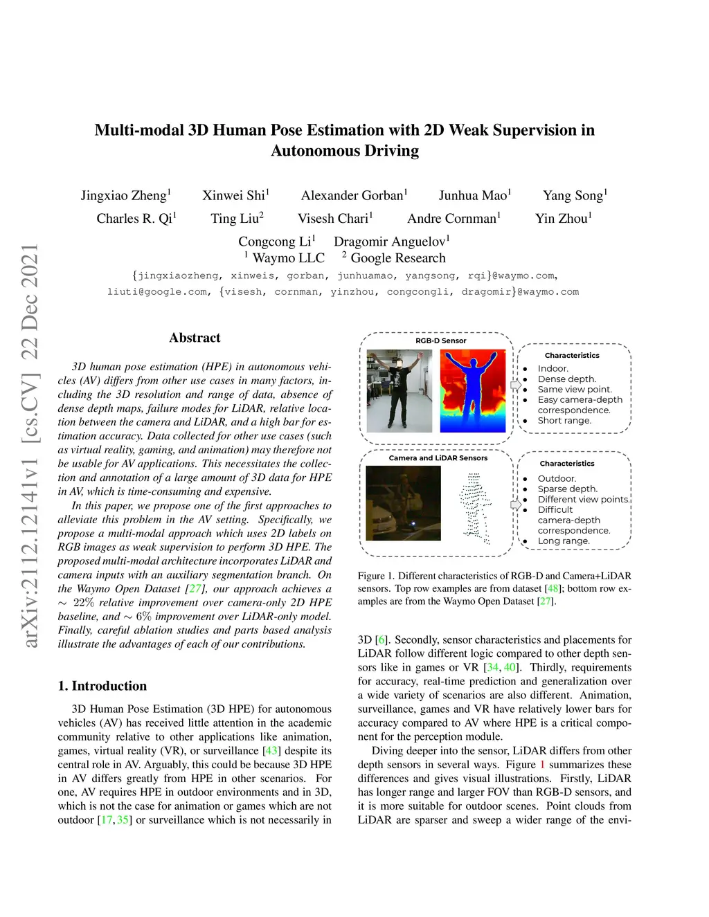 3D human pose estimation (HPE) in autonomous vehicles (AV) differs from other use cases in many factors, including the 3D resolution and range of data, absence of dense depth maps, failure modes for LiDAR, relative location between the camera and LiDAR, and a high bar for estimation accuracy. Data collected for other use cases (such as virtual reality, gaming, and animation) may therefore not be usable for AV applications. This necessitates the collection and annotation of a large amount of 3D data for HPE in AV, which is time-consuming and expensive. In this paper, we propose one of the first approaches to alleviate this problem in the AV setting. Specifically, we propose a multi-modal approach which uses 2D labels on RGB images as weak supervision to perform 3D HPE. The proposed multi-modal architecture incorporates LiDAR and camera inputs with an auxiliary segmentation branch. On the Waymo Open Dataset, our approach achieves a 22% relative improvement over camera-only 2D HPE baseline, and 6% improvement over LiDAR-only model. Finally, careful ablation studies and parts based analysis illustrate the advantages of each of our contributions.