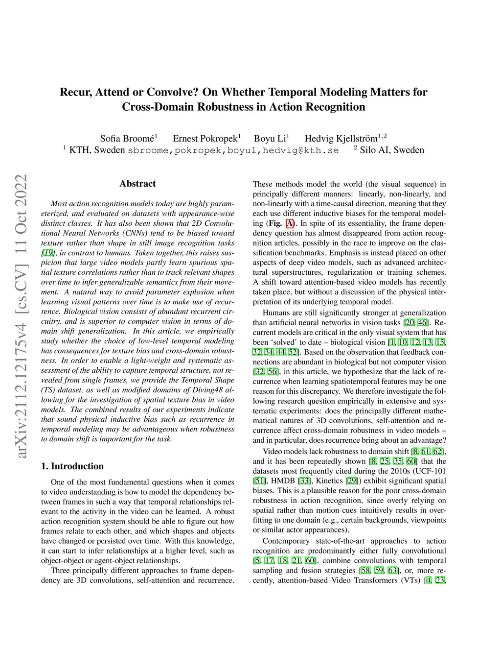 Most action recognition models today are highly parameterized, and evaluated on datasets with appearance-wise distinct classes. It has also been shown that 2D Convolutional Neural Networks (CNNs) tend to be biased toward texture rather than shape in still image recognition tasks, in contrast to humans. Taken together, this raises suspicion that large video models partly learn spurious spatial texture correlations rather than to track relevant shapes over time to infer generalizable semantics from their movement. A natural way to avoid parameter explosion when learning visual patterns over time is to make use of recurrence. Biological vision consists of abundant recurrent circuitry, and is superior to computer vision in terms of domain shift generalization. In this article, we empirically study whether the choice of low-level temporal modeling has consequences for texture bias and cross-domain robustness. In order to enable a light-weight and systematic assessment of the ability to capture temporal structure, not revealed from single frames, we provide the Temporal Shape (TS) dataset, as well as modified domains of Diving48 allowing for the investigation of spatial texture bias in video models. The combined results of our experiments indicate that sound physical inductive bias such as recurrence in temporal modeling may be advantageous when robustness to domain shift is important for the task.