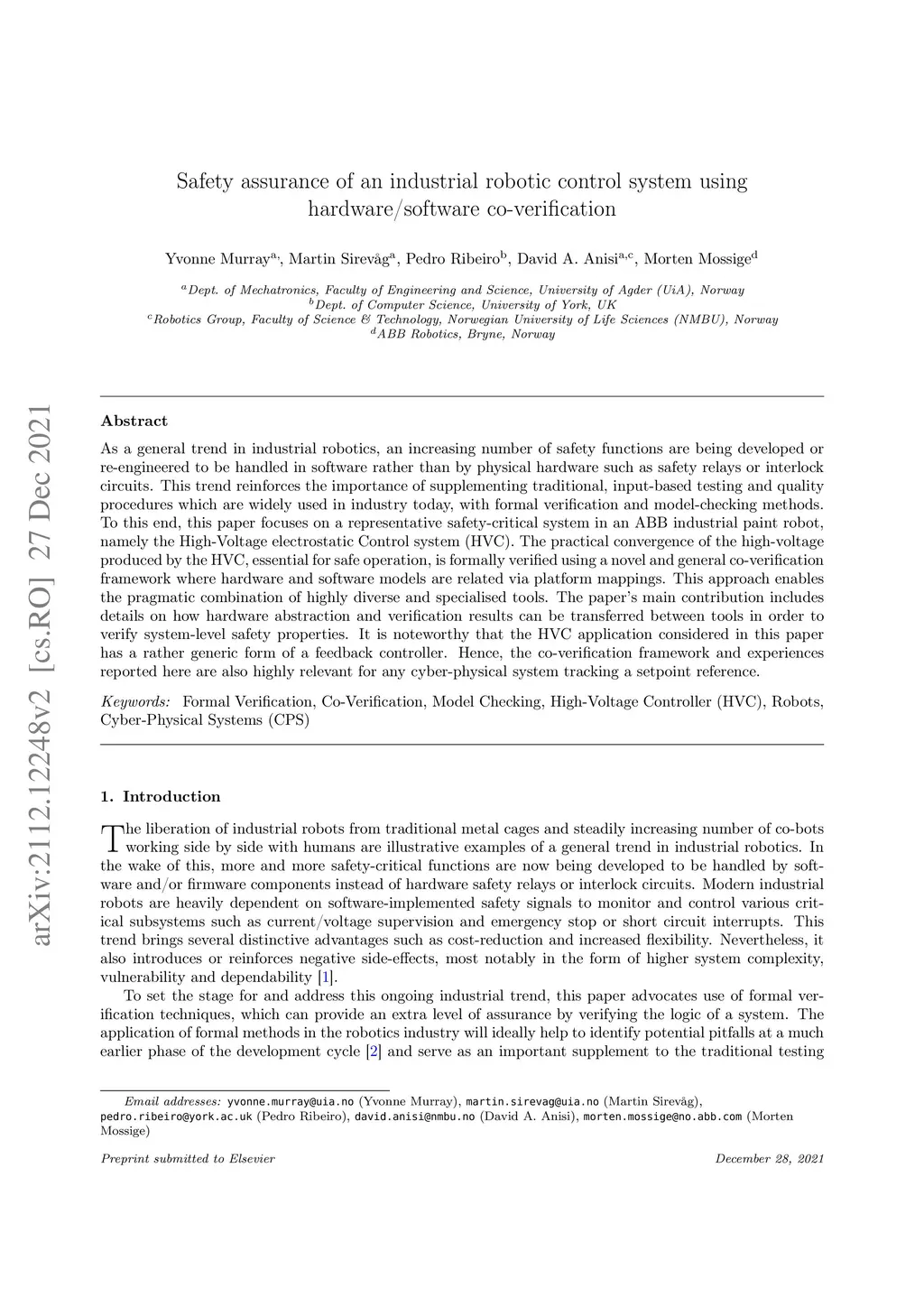 As a general trend in industrial robotics, an increasing number of safety functions are being developed or re-engineered to be handled in software rather than by physical hardware such as safety relays or interlock circuits. This trend reinforces the importance of supplementing traditional, input-based testing and quality procedures which are widely used in industry today, with formal verification and model-checking methods. To this end, this paper focuses on a representative safety-critical system in an ABB industrial paint robot, namely the High-Voltage electrostatic Control system (HVC). The practical convergence of the high-voltage produced by the HVC, essential for safe operation, is formally verified using a novel and general co-verification framework where hardware and software models are related via platform mappings. This approach enables the pragmatic combination of highly diverse and specialised tools. The paper's main contribution includes details on how hardware abstraction and verification results can be transferred between tools in order to verify system-level safety properties. It is noteworthy that the HVC application considered in this paper has a rather generic form of a feedback controller. Hence, the co-verification framework and experiences reported here are also highly relevant for any cyber-physical system tracking a setpoint reference.