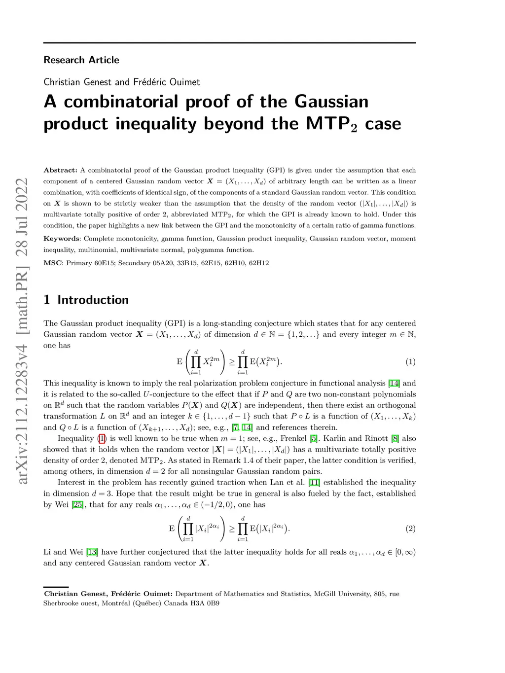A combinatorial proof of the Gaussian product inequality (GPI) is given under the assumption that each component of a centered Gaussian random vector of arbitrary length can be written as a linear combination, with coefficients of identical sign, of the components of a standard Gaussian random vector. This condition on is shown to be strictly weaker than the assumption that the density of the random vector is multivariate totally positive of order , abbreviated MTP, for which the GPI is already known to hold. Under this condition, the paper highlights a new link between the GPI and the monotonicity of a certain ratio of gamma functions.