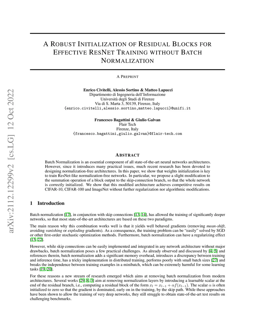 Batch Normalization is an essential component of all state-of-the-art neural networks architectures. However, since it introduces many practical issues, much recent research has been devoted to designing normalization-free architectures. In this paper, we show that weights initialization is key to train ResNet-like normalization-free networks. In particular, we propose a slight modification to the summation operation of a block output to the skip-connection branch, so that the whole network is correctly initialized. We show that this modified architecture achieves competitive results on CIFAR-10, CIFAR-100 and ImageNet without further regularization nor algorithmic modifications.