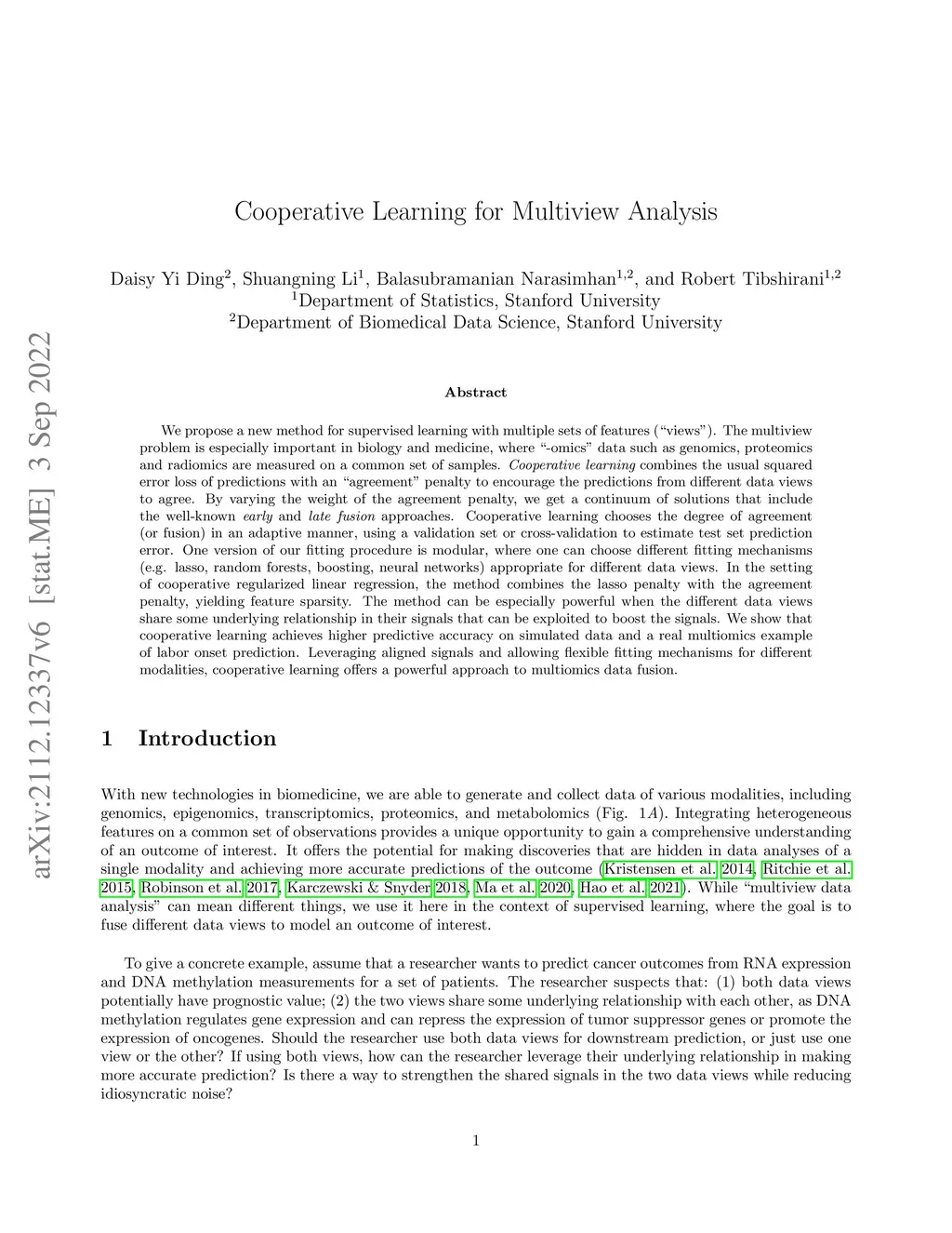 We propose a new method for supervised learning with multiple sets of features ("views"). The multiview problem is especially important in biology and medicine, where "-omics" data such as genomics, proteomics and radiomics are measured on a common set of samples. Cooperative learning combines the usual squared error loss of predictions with an "agreement" penalty to encourage the predictions from different data views to agree. By varying the weight of the agreement penalty, we get a continuum of solutions that include the well-known early and late fusion approaches. Cooperative learning chooses the degree of agreement (or fusion) in an adaptive manner, using a validation set or cross-validation to estimate test set prediction error. One version of our fitting procedure is modular, where one can choose different fitting mechanisms (e.g. lasso, random forests, boosting, neural networks) appropriate for different data views. In the setting of cooperative regularized linear regression, the method combines the lasso penalty with the agreement penalty, yielding feature sparsity. The method can be especially powerful when the different data views share some underlying relationship in their signals that can be exploited to boost the signals. We show that cooperative learning achieves higher predictive accuracy on simulated data and a real multiomics example of labor onset prediction. Leveraging aligned signals and allowing flexible fitting mechanisms for different modalities, cooperative learning offers a powerful approach to multiomics data fusion.