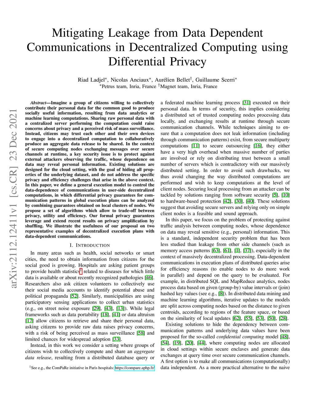 Imagine a group of citizens willing to collectively contribute their personal data for the common good to produce socially useful information, resulting from data analytics or machine learning computations. Sharing raw personal data with a centralized server performing the computation could raise concerns about privacy and a perceived risk of mass surveillance. Instead, citizens may trust each other and their own devices to engage into a decentralized computation to collaboratively produce an aggregate data release to be shared. In the context of secure computing nodes exchanging messages over secure channels at runtime, a key security issue is to protect against external attackers observing the traffic, whose dependence on data may reveal personal information. Existing solutions are designed for the cloud setting, with the goal of hiding all properties of the underlying dataset, and do not address the specific privacy and efficiency challenges that arise in the above context. In this paper, we define a general execution model to control the data-dependence of communications in user-side decentralized computations, in which differential privacy guarantees for communication patterns in global execution plans can be analyzed by combining guarantees obtained on local clusters of nodes. We propose a set of algorithms which allow to trade-off between privacy, utility and efficiency. Our formal privacy guarantees leverage and extend recent results on privacy amplification by shuffling. We illustrate the usefulness of our proposal on two representative examples of decentralized execution plans with data-dependent communications.