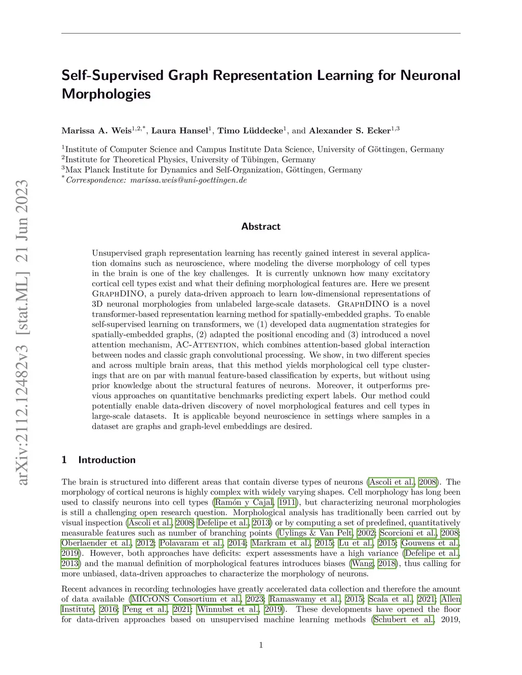 Unsupervised graph representation learning has recently gained interest in several application domains such as neuroscience, where modeling the diverse morphology of cell types in the brain is one of the key challenges. It is currently unknown how many excitatory cortical cell types exist and what their defining morphological features are. Here we present GraphDINO, a purely data-driven approach to learn low-dimensional representations of 3D neuronal morphologies from unlabeled large-scale datasets. GraphDINO is a novel transformer-based representation learning method for spatially-embedded graphs. To enable self-supervised learning on transformers, we (1) developed data augmentation strategies for spatially-embedded graphs, (2) adapted the positional encoding and (3) introduced a novel attention mechanism, AC-Attention, which combines attention-based global interaction between nodes and classic graph convolutional processing. We show, in two different species and across multiple brain areas, that this method yields morphological cell type clusterings that are on par with manual feature-based classification by experts, but without using prior knowledge about the structural features of neurons. Moreover, it outperforms previous approaches on quantitative benchmarks predicting expert labels. Our method could potentially enable data-driven discovery of novel morphological features and cell types in large-scale datasets. It is applicable beyond neuroscience in settings where samples in a dataset are graphs and graph-level embeddings are desired.