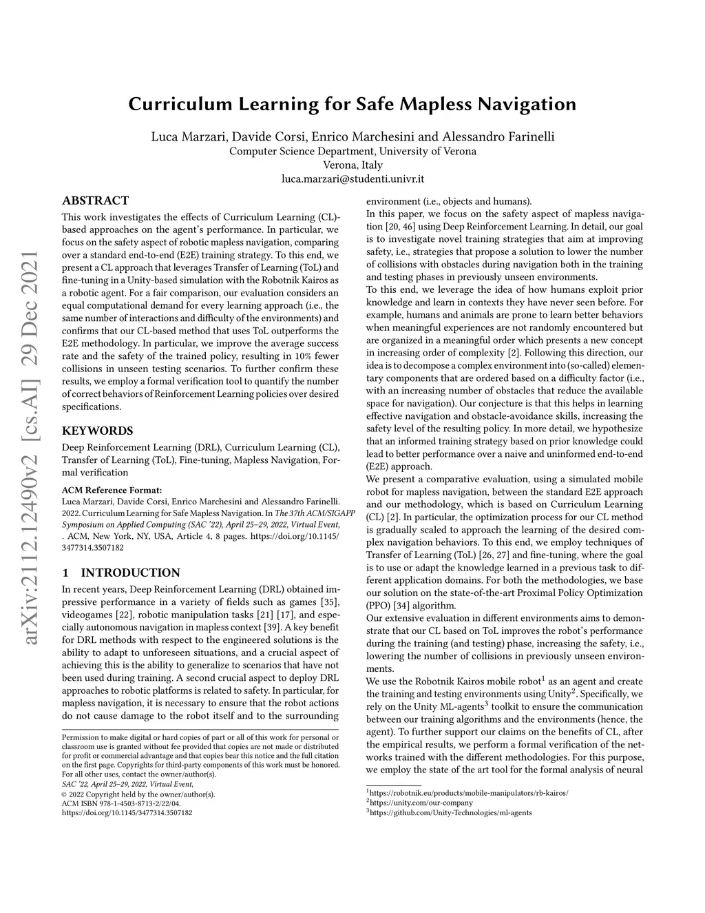 This work investigates the effects of Curriculum Learning (CL)-based approaches on the agent's performance. In particular, we focus on the safety aspect of robotic mapless navigation, comparing over a standard end-to-end (E2E) training strategy. To this end, we present a CL approach that leverages Transfer of Learning (ToL) and fine-tuning in a Unity-based simulation with the Robotnik Kairos as a robotic agent. For a fair comparison, our evaluation considers an equal computational demand for every learning approach (i.e., the same number of interactions and difficulty of the environments) and confirms that our CL-based method that uses ToL outperforms the E2E methodology. In particular, we improve the average success rate and the safety of the trained policy, resulting in 10% fewer collisions in unseen testing scenarios. To further confirm these results, we employ a formal verification tool to quantify the number of correct behaviors of Reinforcement Learning policies over desired specifications.