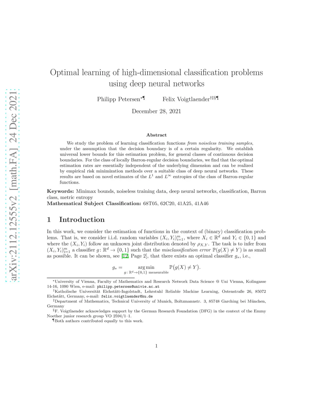We study the problem of learning classification functions from noiseless training samples, under the assumption that the decision boundary is of a certain regularity. We establish universal lower bounds for this estimation problem, for general classes of continuous decision boundaries. For the class of locally Barron-regular decision boundaries, we find that the optimal estimation rates are essentially independent of the underlying dimension and can be realized by empirical risk minimization methods over a suitable class of deep neural networks. These results are based on novel estimates of the and entropies of the class of Barron-regular functions.