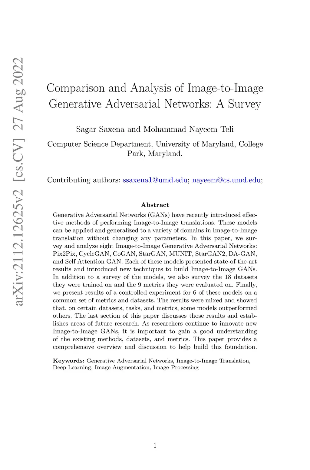 Generative Adversarial Networks (GANs) have recently introduced effective methods of performing Image-to-Image translations. These models can be applied and generalized to a variety of domains in Image-to-Image translation without changing any parameters. In this paper, we survey and analyze eight Image-to-Image Generative Adversarial Networks: Pix2Pix, CycleGAN, CoGAN, StarGAN, MUNIT, StarGAN2, DA-GAN, and Self Attention GAN. Each of these models presented state-of-the-art results and introduced new techniques to build Image-to-Image GANs. In addition to a survey of the models, we also survey the 18 datasets they were trained on and the 9 metrics they were evaluated on. Finally, we present results of a controlled experiment for 6 of these models on a common set of metrics and datasets. The results were mixed and showed that, on certain datasets, tasks, and metrics, some models outperformed others. The last section of this paper discusses those results and establishes areas of future research. As researchers continue to innovate new Image-to-Image GANs, it is important to gain a good understanding of the existing methods, datasets, and metrics. This paper provides a comprehensive overview and discussion to help build this foundation.