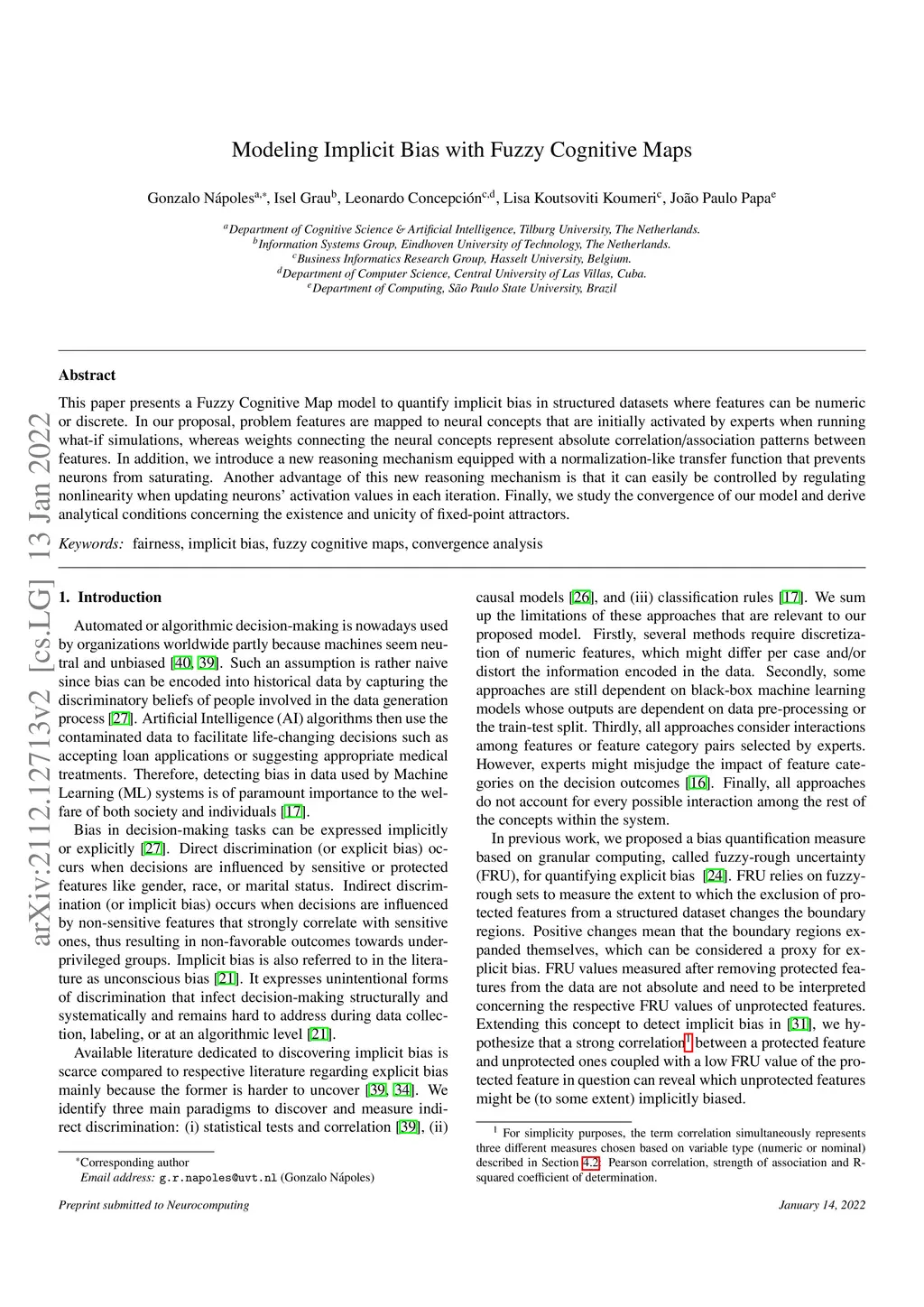 This paper presents a Fuzzy Cognitive Map model to quantify implicit bias in structured datasets where features can be numeric or discrete. In our proposal, problem features are mapped to neural concepts that are initially activated by experts when running what-if simulations, whereas weights connecting the neural concepts represent absolute correlation/association patterns between features. In addition, we introduce a new reasoning mechanism equipped with a normalization-like transfer function that prevents neurons from saturating. Another advantage of this new reasoning mechanism is that it can easily be controlled by regulating nonlinearity when updating neurons' activation values in each iteration. Finally, we study the convergence of our model and derive analytical conditions concerning the existence and unicity of fixed-point attractors.