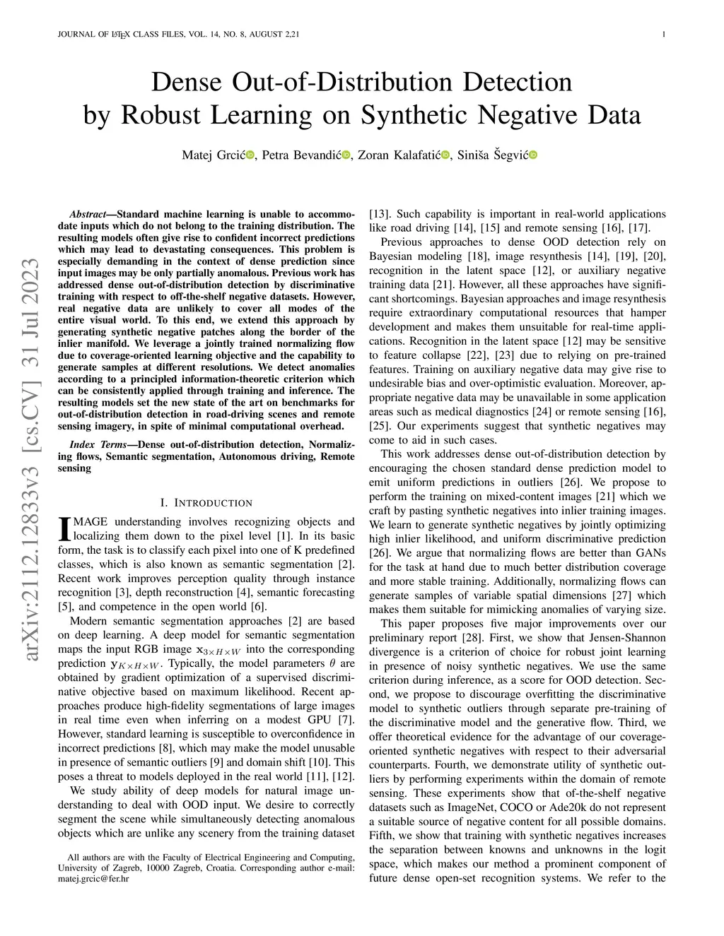 Standard machine learning is unable to accommodate inputs which do not belong to the training distribution. The resulting models often give rise to confident incorrect predictions which may lead to devastating consequences. This problem is especially demanding in the context of dense prediction since input images may be only partially anomalous. Previous work has addressed dense out-of-distribution detection by discriminative training with respect to off-the-shelf negative datasets. However, real negative data are unlikely to cover all modes of the entire visual world. To this end, we extend this approach by generating synthetic negative patches along the border of the inlier manifold. We leverage a jointly trained normalizing flow due to coverage-oriented learning objective and the capability to generate samples at different resolutions. We detect anomalies according to a principled information-theoretic criterion which can be consistently applied through training and inference. The resulting models set the new state of the art on benchmarks for out-of-distribution detection in road-driving scenes and remote sensing imagery, in spite of minimal computational overhead.