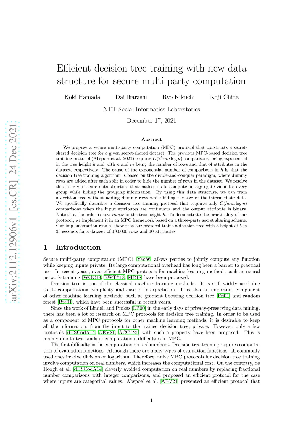 Efficient decision tree training with new data structure for secure