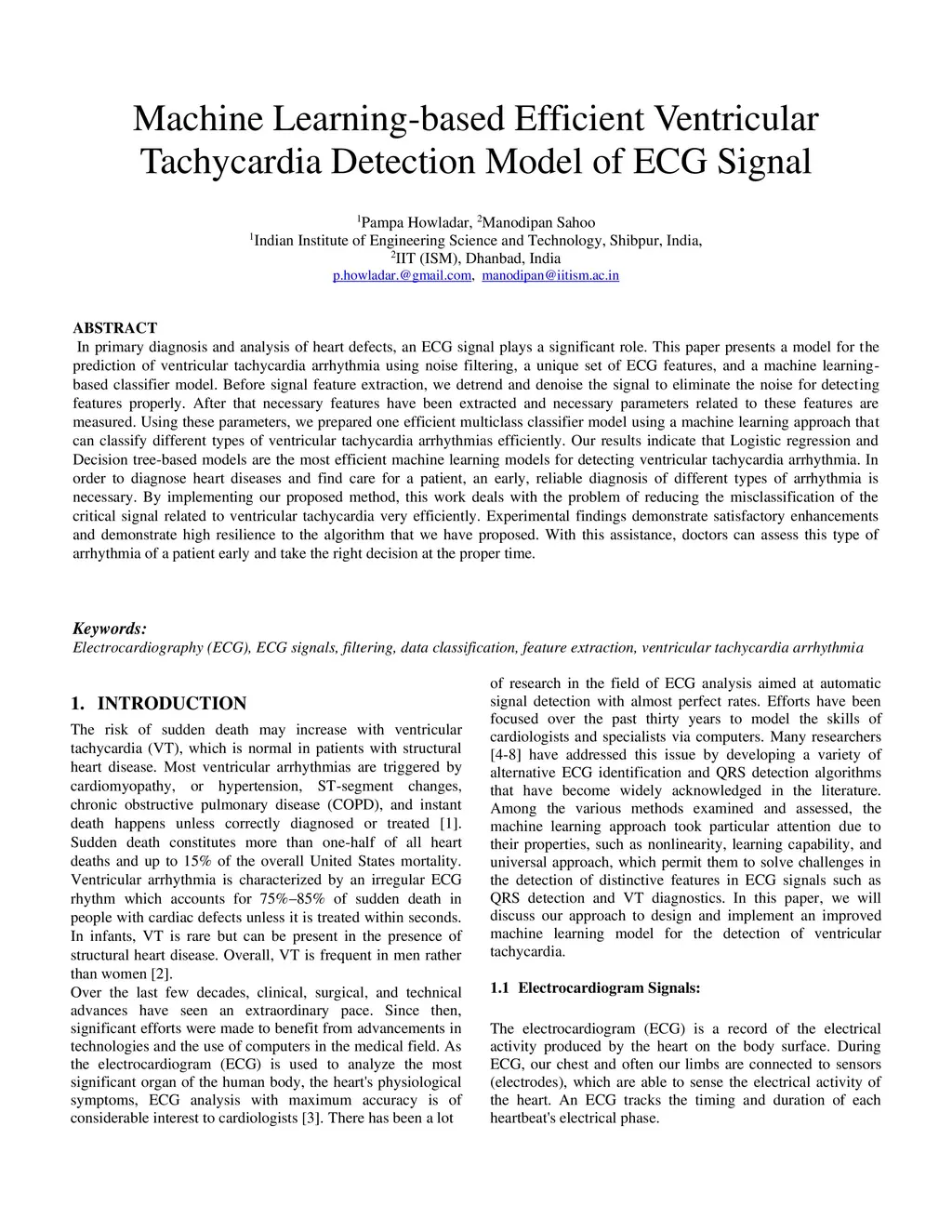Machine Learning-based Efficient Ventricular Tachycardia Detection Model