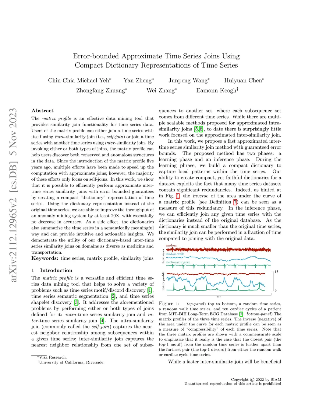 The matrix profile is an effective data mining tool that provides similarity join functionality for time series data. Users of the matrix profile can either join a time series with itself using intra-similarity join (i.e., self-join) or join a time series with another time series using inter-similarity join. By invoking either or both types of joins, the matrix profile can help users discover both conserved and anomalous structures in the data. Since the introduction of the matrix profile five years ago, multiple efforts have been made to speed up the computation with approximate joins; however, the majority of these efforts only focus on self-joins. In this work, we show that it is possible to efficiently perform approximate inter-time series similarity joins with error bounded guarantees by creating a compact "dictionary" representation of time series. Using the dictionary representation instead of the original time series, we are able to improve the throughput of an anomaly mining system by at least 20X, with essentially no decrease in accuracy. As a side effect, the dictionaries also summarize the time series in a semantically meaningful way and can provide intuitive and actionable insights. We demonstrate the utility of our dictionary-based inter-time series similarity joins on domains as diverse as medicine and transportation.