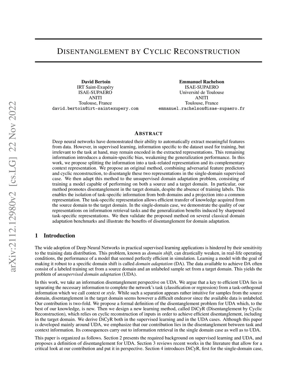 Deep neural networks have demonstrated their ability to automatically extract meaningful features from data. However, in supervised learning, information specific to the dataset used for training, but irrelevant to the task at hand, may remain encoded in the extracted representations. This remaining information introduces a domain-specific bias, weakening the generalization performance. In this work, we propose splitting the information into a task-related representation and its complementary context representation. We propose an original method, combining adversarial feature predictors and cyclic reconstruction, to disentangle these two representations in the single-domain supervised case. We then adapt this method to the unsupervised domain adaptation problem, consisting of training a model capable of performing on both a source and a target domain. In particular, our method promotes disentanglement in the target domain, despite the absence of training labels. This enables the isolation of task-specific information from both domains and a projection into a common representation. The task-specific representation allows efficient transfer of knowledge acquired from the source domain to the target domain. In the single-domain case, we demonstrate the quality of our representations on information retrieval tasks and the generalization benefits induced by sharpened task-specific representations. We then validate the proposed method on several classical domain adaptation benchmarks and illustrate the benefits of disentanglement for domain adaptation.