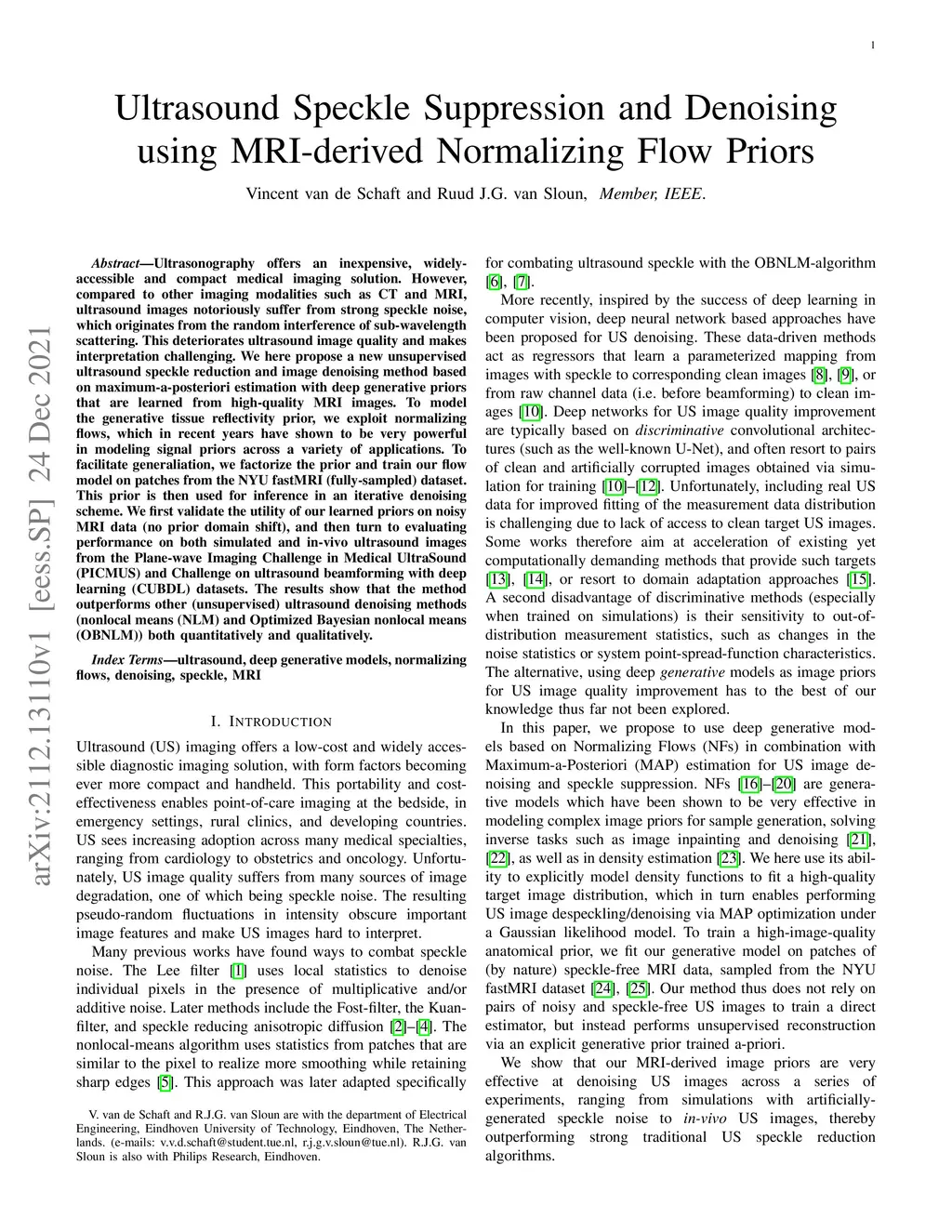 Ultrasonography offers an inexpensive, widely-accessible and compact medical imaging solution. However, compared to other imaging modalities such as CT and MRI, ultrasound images notoriously suffer from strong speckle noise, which originates from the random interference of sub-wavelength scattering. This deteriorates ultrasound image quality and makes interpretation challenging. We here propose a new unsupervised ultrasound speckle reduction and image denoising method based on maximum-a-posteriori estimation with deep generative priors that are learned from high-quality MRI images. To model the generative tissue reflectivity prior, we exploit normalizing flows, which in recent years have shown to be very powerful in modeling signal priors across a variety of applications. To facilitate generaliation, we factorize the prior and train our flow model on patches from the NYU fastMRI (fully-sampled) dataset. This prior is then used for inference in an iterative denoising scheme. We first validate the utility of our learned priors on noisy MRI data (no prior domain shift), and then turn to evaluating performance on both simulated and in-vivo ultrasound images from the PICMUS and CUBDL datasets. The results show that the method outperforms other (unsupervised) ultrasound denoising methods (NLM and OBNLM) both quantitatively and qualitatively.