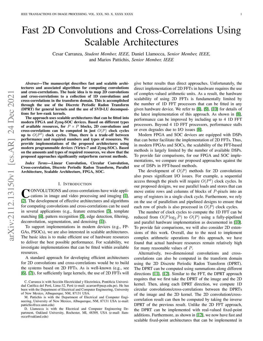 The manuscript describes fast and scalable architectures and associated algorithms for computing convolutions and cross-correlations. The basic idea is to map 2D convolutions and cross-correlations to a collection of 1D convolutions and cross-correlations in the transform domain. This is accomplished through the use of the Discrete Periodic Radon Transform (DPRT) for general kernels and the use of SVD-LU decompositions for low-rank kernels. The approach uses scalable architectures that can be fitted into modern FPGA and Zynq-SOC devices. Based on different types of available resources, for blocks, 2D convolutions and cross-correlations can be computed in just clock cycles up to clock cycles. Thus, there is a trade-off between performance and required numbers and types of resources. We provide implementations of the proposed architectures using modern programmable devices (Virtex-7 and Zynq-SOC). Based on the amounts and types of required resources, we show that the proposed approaches significantly outperform current methods.