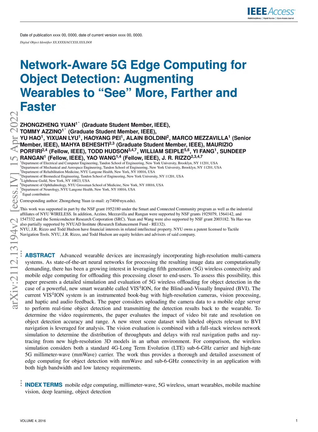 Advanced wearable devices are increasingly incorporating high-resolution multi-camera systems. As state-of-the-art neural networks for processing the resulting image data are computationally demanding, there has been growing interest in leveraging fifth generation (5G) wireless connectivity and mobile edge computing for offloading this processing to the cloud. To assess this possibility, this paper presents a detailed simulation and evaluation of 5G wireless offloading for object detection within a powerful, new smart wearable called VIS4ION, for the Blind-and-Visually Impaired (BVI). The current VIS4ION system is an instrumented book-bag with high-resolution cameras, vision processing and haptic and audio feedback. The paper considers uploading the camera data to a mobile edge cloud to perform real-time object detection and transmitting the detection results back to the wearable. To determine the video requirements, the paper evaluates the impact of video bit rate and resolution on object detection accuracy and range. A new street scene dataset with labeled objects relevant to BVI navigation is leveraged for analysis. The vision evaluation is combined with a detailed full-stack wireless network simulation to determine the distribution of throughputs and delays with real navigation paths and ray-tracing from new high-resolution 3D models in an urban environment. For comparison, the wireless simulation considers both a standard 4G-Long Term Evolution (LTE) carrier and high-rate 5G millimeter-wave (mmWave) carrier. The work thus provides a thorough and realistic assessment of edge computing with mmWave connectivity in an application with both high bandwidth and low latency requirements.