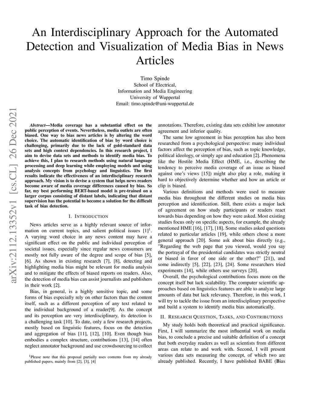 Media coverage has a substantial effect on the public perception of events. Nevertheless, media outlets are often biased. One way to bias news articles is by altering the word choice. The automatic identification of bias by word choice is challenging, primarily due to the lack of gold-standard data sets and high context dependencies. In this research project, I aim to devise data sets and methods to identify media bias. To achieve this, I plan to research methods using natural language processing and deep learning while employing models and using analysis concepts from psychology and linguistics. The first results indicate the effectiveness of an interdisciplinary research approach. My vision is to devise a system that helps news readers become aware of media coverage differences caused by bias. So far, my best performing BERT-based model is pre-trained on a larger corpus consisting of distant labels, indicating that distant supervision has the potential to become a solution for the difficult task of bias detection.