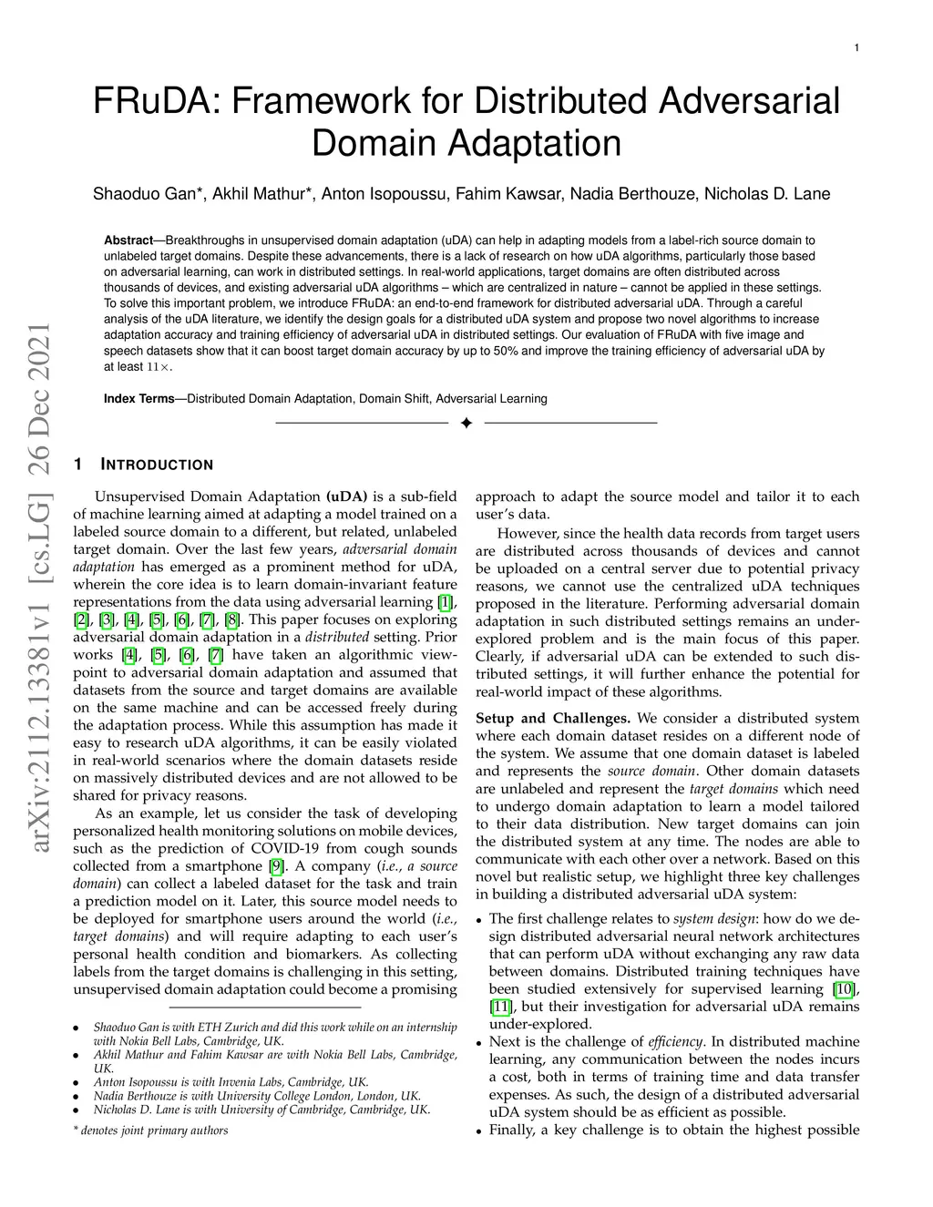 Breakthroughs in unsupervised domain adaptation (uDA) can help in adapting models from a label-rich source domain to unlabeled target domains. Despite these advancements, there is a lack of research on how uDA algorithms, particularly those based on adversarial learning, can work in distributed settings. In real-world applications, target domains are often distributed across thousands of devices, and existing adversarial uDA algorithms -- which are centralized in nature -- cannot be applied in these settings. To solve this important problem, we introduce FRuDA: an end-to-end framework for distributed adversarial uDA. Through a careful analysis of the uDA literature, we identify the design goals for a distributed uDA system and propose two novel algorithms to increase adaptation accuracy and training efficiency of adversarial uDA in distributed settings. Our evaluation of FRuDA with five image and speech datasets show that it can boost target domain accuracy by up to 50% and improve the training efficiency of adversarial uDA by at least 11 times.