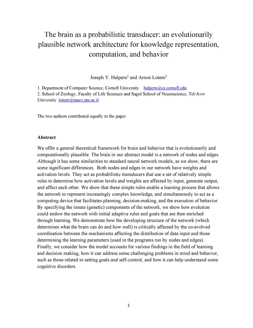 We offer a general theoretical framework for brain and behavior that is evolutionarily and computationally plausible. The brain in our abstract model is a network of nodes and edges. Although it has some similarities to standard neural network models, as we show, there are some significant differences. Both nodes and edges in our network have weights and activation levels. They act as probabilistic transducers that use a set of relatively simple rules to determine how activation levels and weights are affected by input, generate output, and affect each other. We show that these simple rules enable a learning process that allows the network to represent increasingly complex knowledge, and simultaneously to act as a computing device that facilitates planning, decision-making, and the execution of behavior. By specifying the innate (genetic) components of the network, we show how evolution could endow the network with initial adaptive rules and goals that are then enriched through learning. We demonstrate how the developing structure of the network (which determines what the brain can do and how well) is critically affected by the co-evolved coordination between the mechanisms affecting the distribution of data input and those determining the learning parameters (used in the programs run by nodes and edges). Finally, we consider how the model accounts for various findings in the field of learning and decision making, how it can address some challenging problems in mind and behavior, such as those related to setting goals and self-control, and how it can help understand some cognitive disorders.