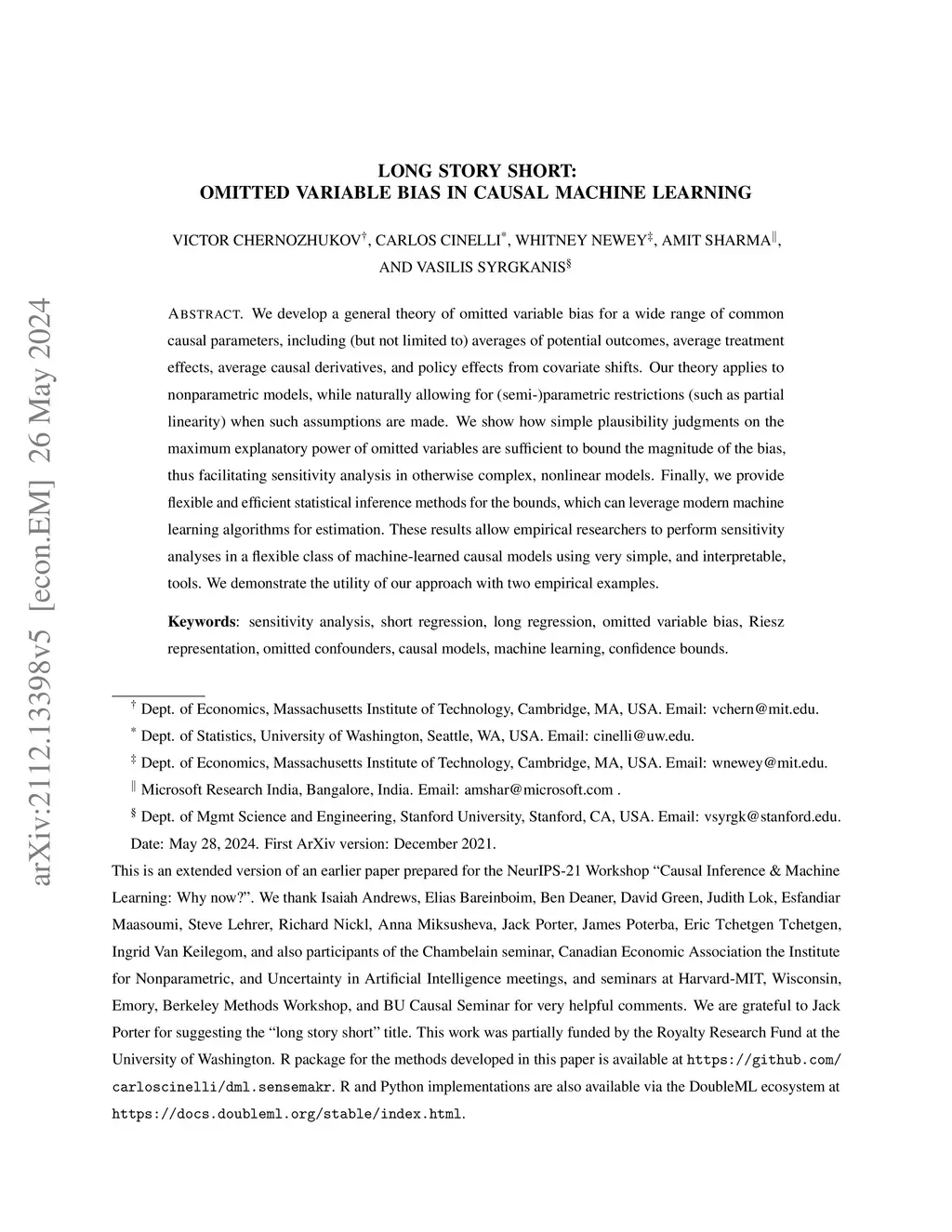 We derive general, yet simple, sharp bounds on the size of the omitted variable bias for a broad class of causal parameters that can be identified as linear functionals of the conditional expectation function of the outcome. Such functionals encompass many of the traditional targets of investigation in causal inference studies, such as, for example, (weighted) average of potential outcomes, average treatment effects (including subgroup effects, such as the effect on the treated), (weighted) average derivatives, and policy effects from shifts in covariate distribution -- all for general, nonparametric causal models. Our construction relies on the Riesz-Frechet representation of the target functional. Specifically, we show how the bound on the bias depends only on the additional variation that the latent variables create both in the outcome and in the Riesz representer for the parameter of interest. Moreover, in many important cases (e.g, average treatment effects in partially linear models, or in nonseparable models with a binary treatment) the bound is shown to depend on two easily interpretable quantities: the nonparametric partial (Pearson's "correlation ratio") of the unobserved variables with the treatment and with the outcome. Therefore, simple plausibility judgments on the maximum explanatory power of omitted variables (in explaining treatment and outcome variation) are sufficient to place overall bounds on the size of the bias. Finally, leveraging debiased machine learning, we provide flexible and efficient statistical inference methods to estimate the components of the bounds that are identifiable from the observed distribution.