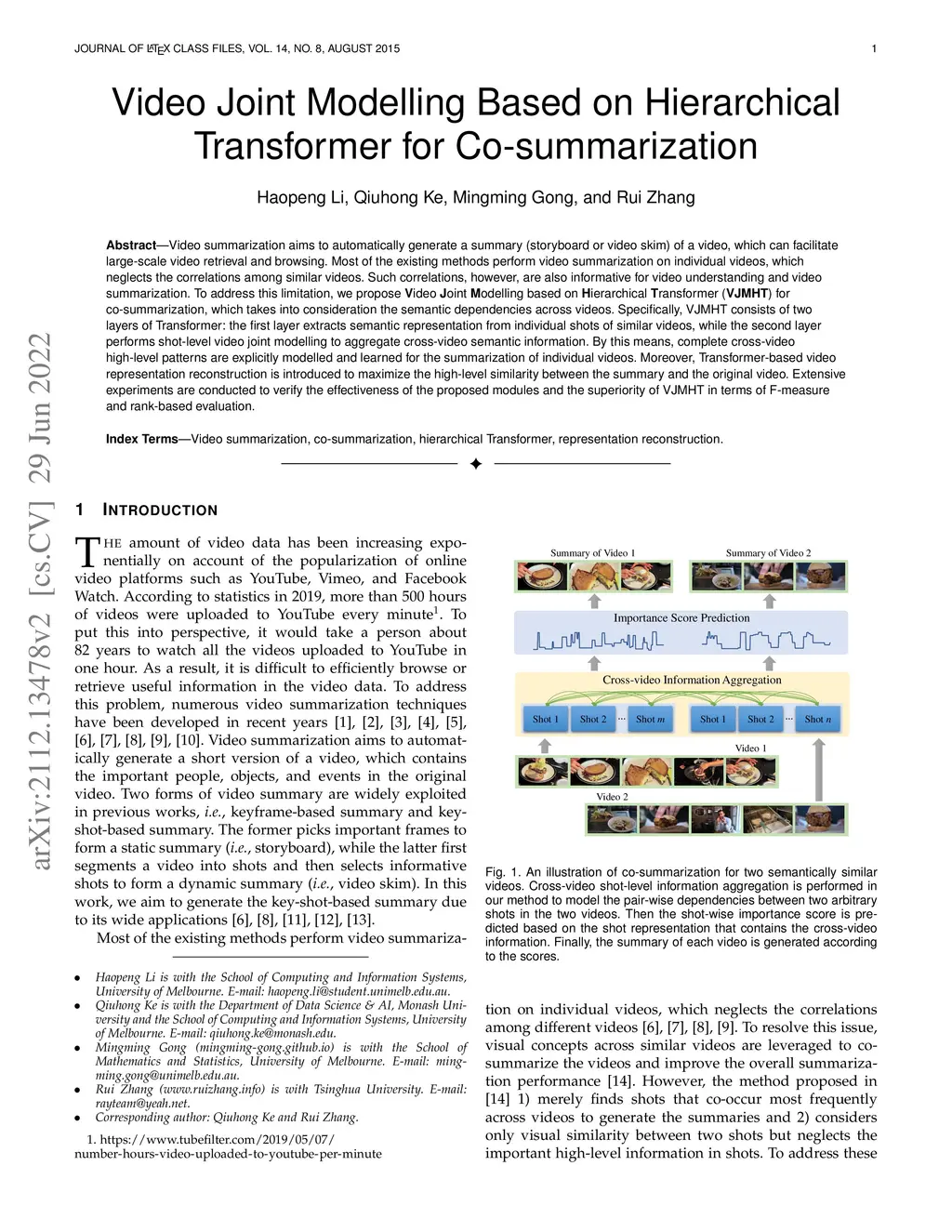 Video summarization aims to automatically generate a summary (storyboard or video skim) of a video, which can facilitate large-scale video retrieval and browsing. Most of the existing methods perform video summarization on individual videos, which neglects the correlations among similar videos. Such correlations, however, are also informative for video understanding and video summarization. To address this limitation, we propose Video Joint Modelling based on Hierarchical Transformer (VJMHT) for co-summarization, which takes into consideration the semantic dependencies across videos. Specifically, VJMHT consists of two layers of Transformer: the first layer extracts semantic representation from individual shots of similar videos, while the second layer performs shot-level video joint modelling to aggregate cross-video semantic information. By this means, complete cross-video high-level patterns are explicitly modelled and learned for the summarization of individual videos. Moreover, Transformer-based video representation reconstruction is introduced to maximize the high-level similarity between the summary and the original video. Extensive experiments are conducted to verify the effectiveness of the proposed modules and the superiority of VJMHT in terms of F-measure and rank-based evaluation.
