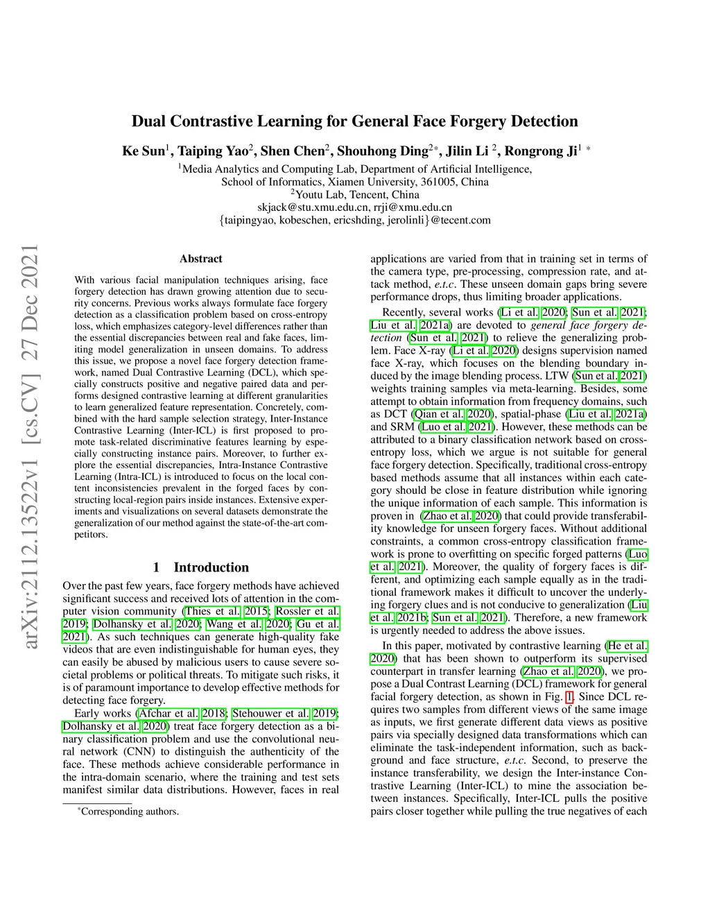 With various facial manipulation techniques arising, face forgery detection has drawn growing attention due to security concerns. Previous works always formulate face forgery detection as a classification problem based on cross-entropy loss, which emphasizes category-level differences rather than the essential discrepancies between real and fake faces, limiting model generalization in unseen domains. To address this issue, we propose a novel face forgery detection framework, named Dual Contrastive Learning (DCL), which specially constructs positive and negative paired data and performs designed contrastive learning at different granularities to learn generalized feature representation. Concretely, combined with the hard sample selection strategy, Inter-Instance Contrastive Learning (Inter-ICL) is first proposed to promote task-related discriminative features learning by especially constructing instance pairs. Moreover, to further explore the essential discrepancies, Intra-Instance Contrastive Learning (Intra-ICL) is introduced to focus on the local content inconsistencies prevalent in the forged faces by constructing local-region pairs inside instances. Extensive experiments and visualizations on several datasets demonstrate the generalization of our method against the state-of-the-art competitors.
