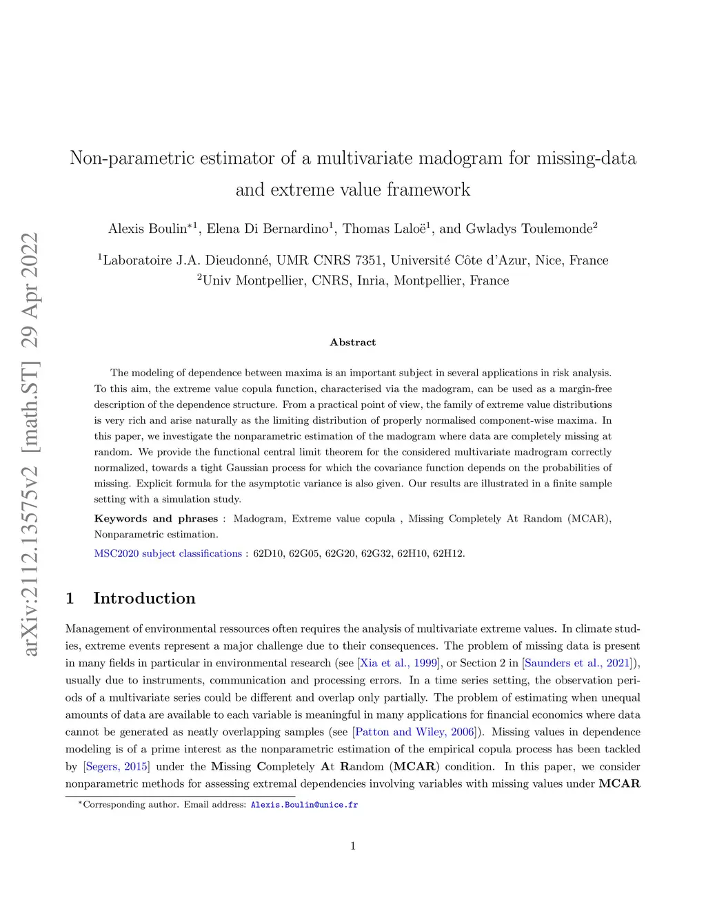 The modeling of dependence between maxima is an important subject in several applications in risk analysis. To this aim, the extreme value copula function, characterised via the madogram, can be used as a margin-free description of the dependence structure. From a practical point of view, the family of extreme value distributions is very rich and arise naturally as the limiting distribution of properly normalised component-wise maxima. In this paper, we investigate the nonparametric estimation of the madogram where data are completely missing at random. We provide the functional central limit theorem for the considered multivariate madrogram correctly normalized, towards a tight Gaussian process for which the covariance function depends on the probabilities of missing. Explicit formula for the asymptotic variance is also given. Our results are illustrated in a finite sample setting with a simulation study.