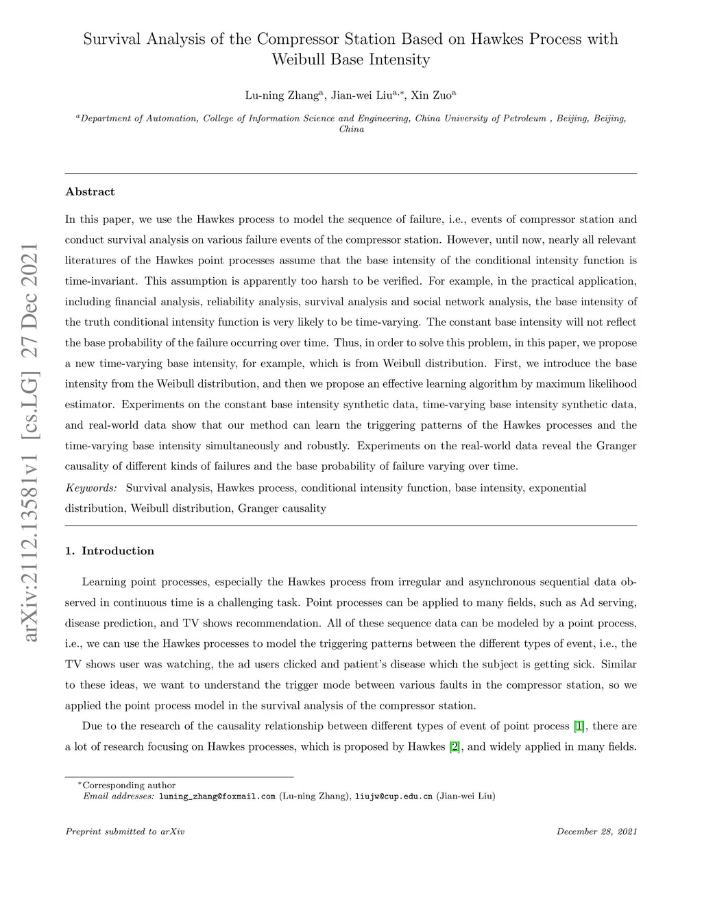 In this paper, we use the Hawkes process to model the sequence of failure, i.e., events of compressor station and conduct survival analysis on various failure events of the compressor station. However, until now, nearly all relevant literatures of the Hawkes point processes assume that the base intensity of the conditional intensity function is time-invariant. This assumption is apparently too harsh to be verified. For example, in the practical application, including financial analysis, reliability analysis, survival analysis and social network analysis, the base intensity of the truth conditional intensity function is very likely to be time-varying. The constant base intensity will not reflect the base probability of the failure occurring over time. Thus, in order to solve this problem, in this paper, we propose a new time-varying base intensity, for example, which is from Weibull distribution. First, we introduce the base intensity from the Weibull distribution, and then we propose an effective learning algorithm by maximum likelihood estimator. Experiments on the constant base intensity synthetic data, time-varying base intensity synthetic data, and real-world data show that our method can learn the triggering patterns of the Hawkes processes and the time-varying base intensity simultaneously and robustly. Experiments on the real-world data reveal the Granger causality of different kinds of failures and the base probability of failure varying over time.