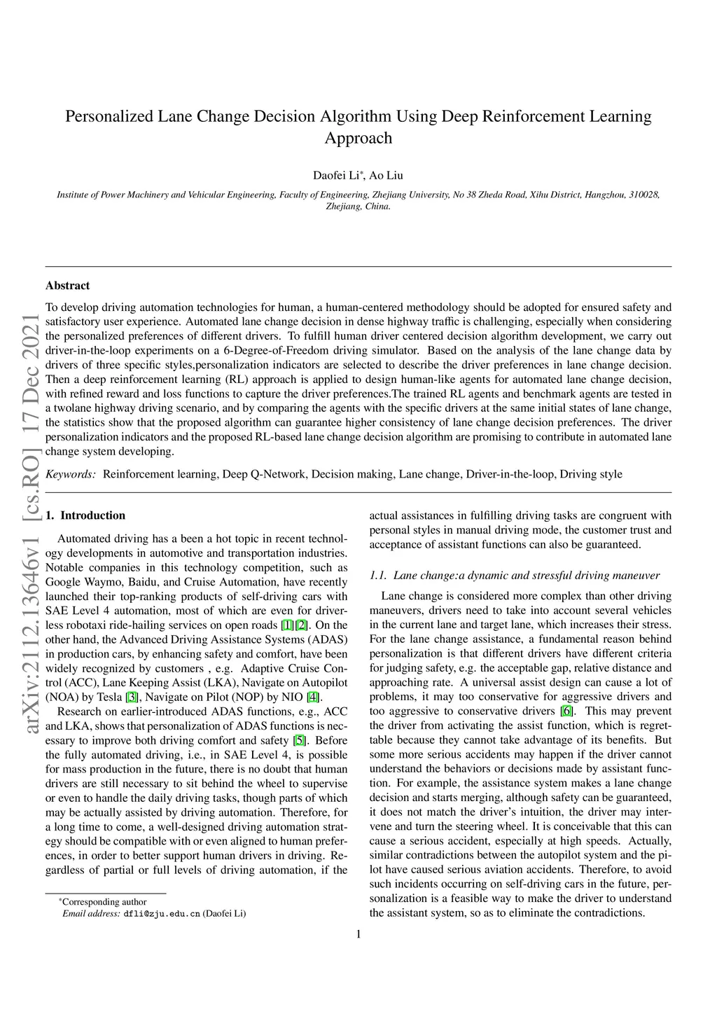 Personalized Lane Change Decision Algorithm Using Deep Reinforcement